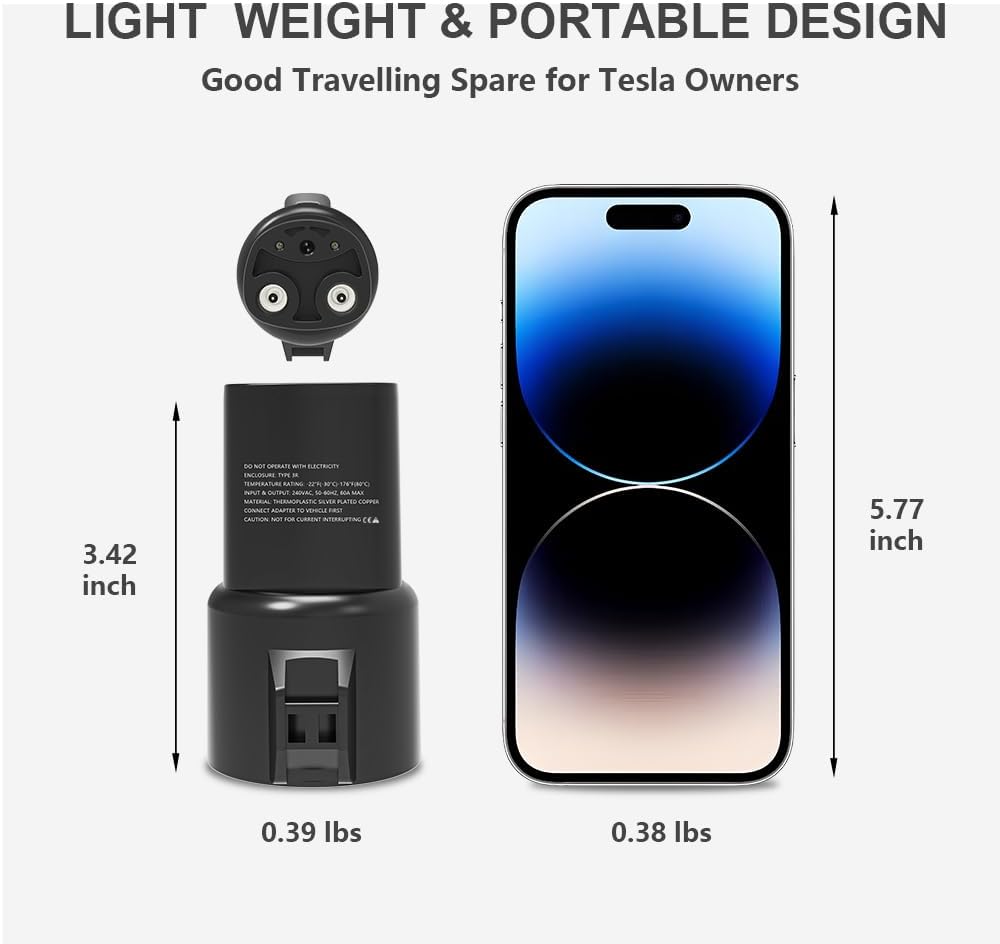 مواصفات محول J1772 إلى TESLA - 240 فولت تيار متردد، 50-60 هرتز، 80 أمبير كحد أقصى (تيار يصل إلى 80 أمبير، اعتمادًا على مقدار التيار الذي تم تصنيف الشاحن الخاص بك لتحمله.). مع درجة حرارة تشغيل تتراوح من -30 درجة مئوية إلى 80 درجة مئوية (-22 درجة فهرنهايت إلى 176 درجة فهرنهايت). قم بتوصيل/إخراج 10000 مرة.
