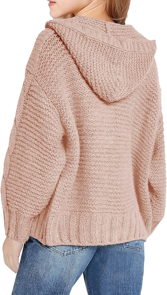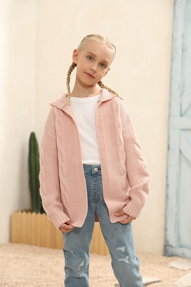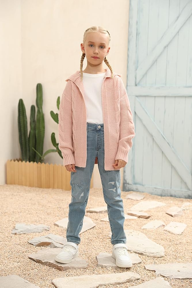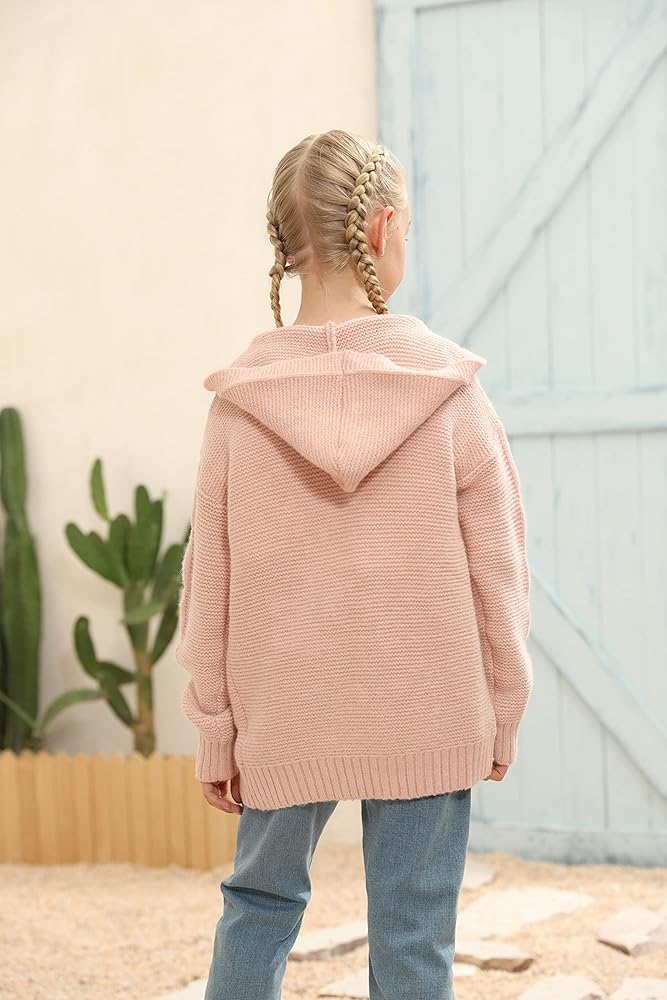سترة PiePieBuy للفتيات والأطفال بغطاء للرأس مفتوحة من الأمام وأكمام طويلة سترة منسوجة للخريف والشتاء باللون الوردي