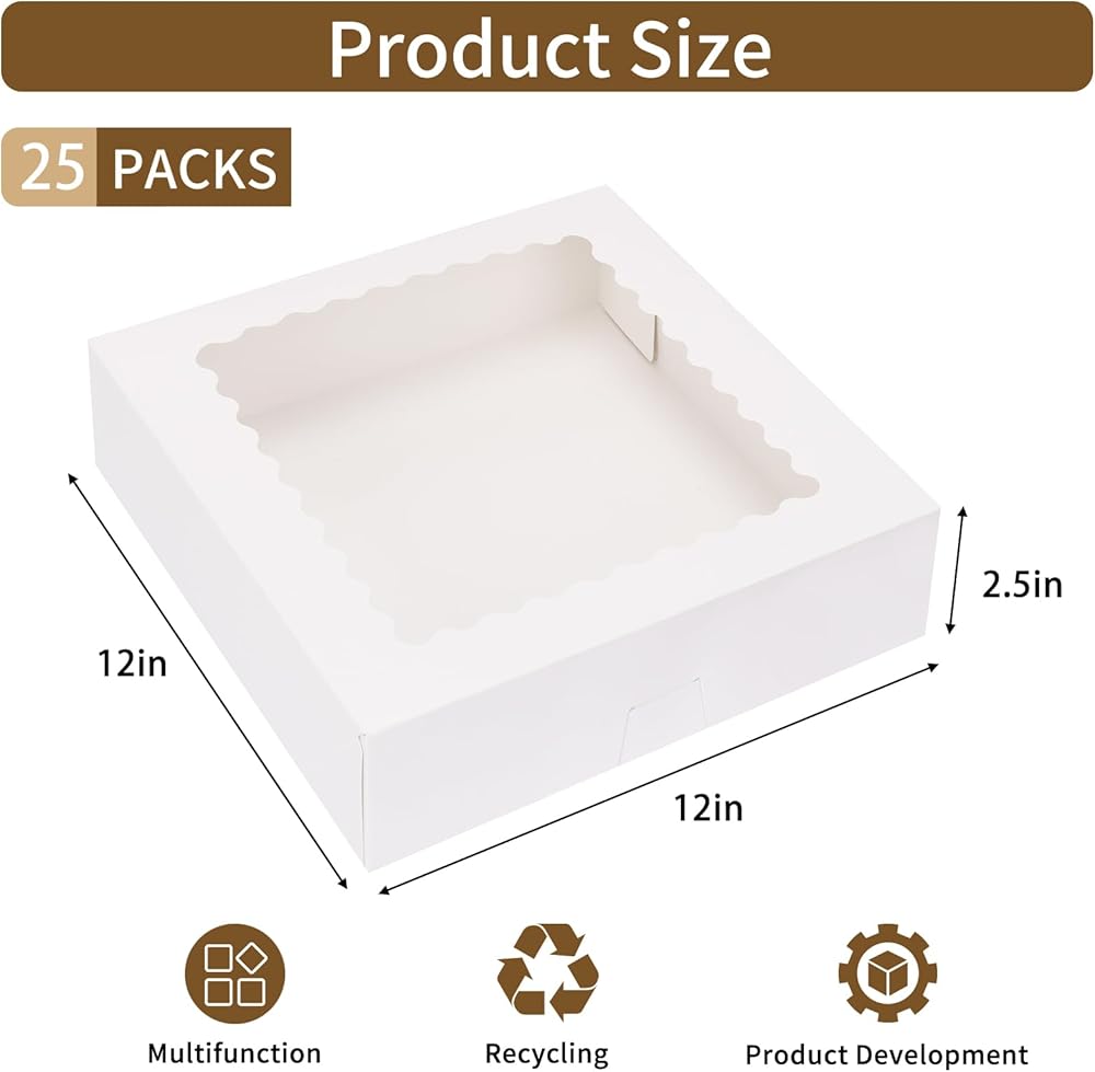 تحتوي العبوة على: تحتوي هذه العبوة على 12 قطعة من صناديق الكيك البيضاء (10x10x8 12x12x8)، كل حجم 6 عبوات. الكمية كافية لتلبية معظم احتياجاتك.
