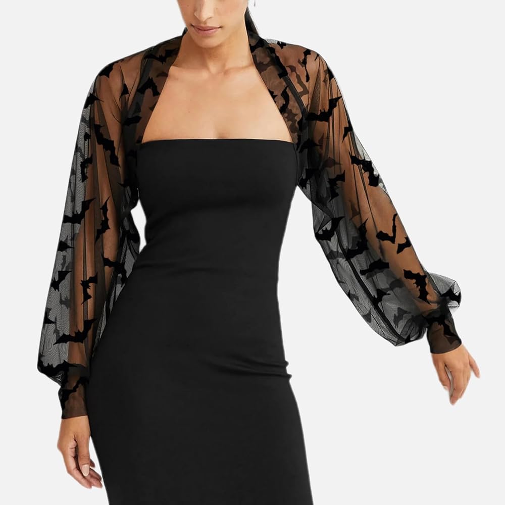 السمات: تصميم خفاش، مفتوح من الأمام، جزء علوي قصير، نسيج شبكي مثير، أكمام طويلة وطول قصير لأسلوب فريد ومظهر Y2K عصري وقوطي.