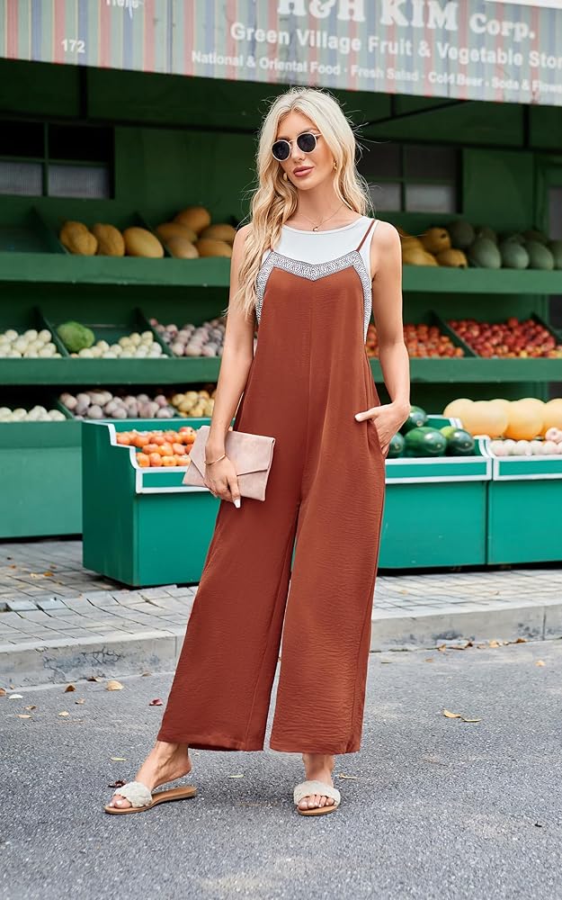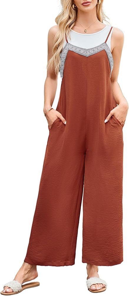 تصميم فريد: بذلة فضفاضة للنساء، سراويل عصرية بأرجل واسعة، طراز فضفاض، تصميم رقبة على شكل حرف V، بذلة بحمالات سباغيتي، ملابس صيفية كاجوال، مع جيبين جانبيين، لون ثابت، يجعلك تبدو أنيقة جدًا.