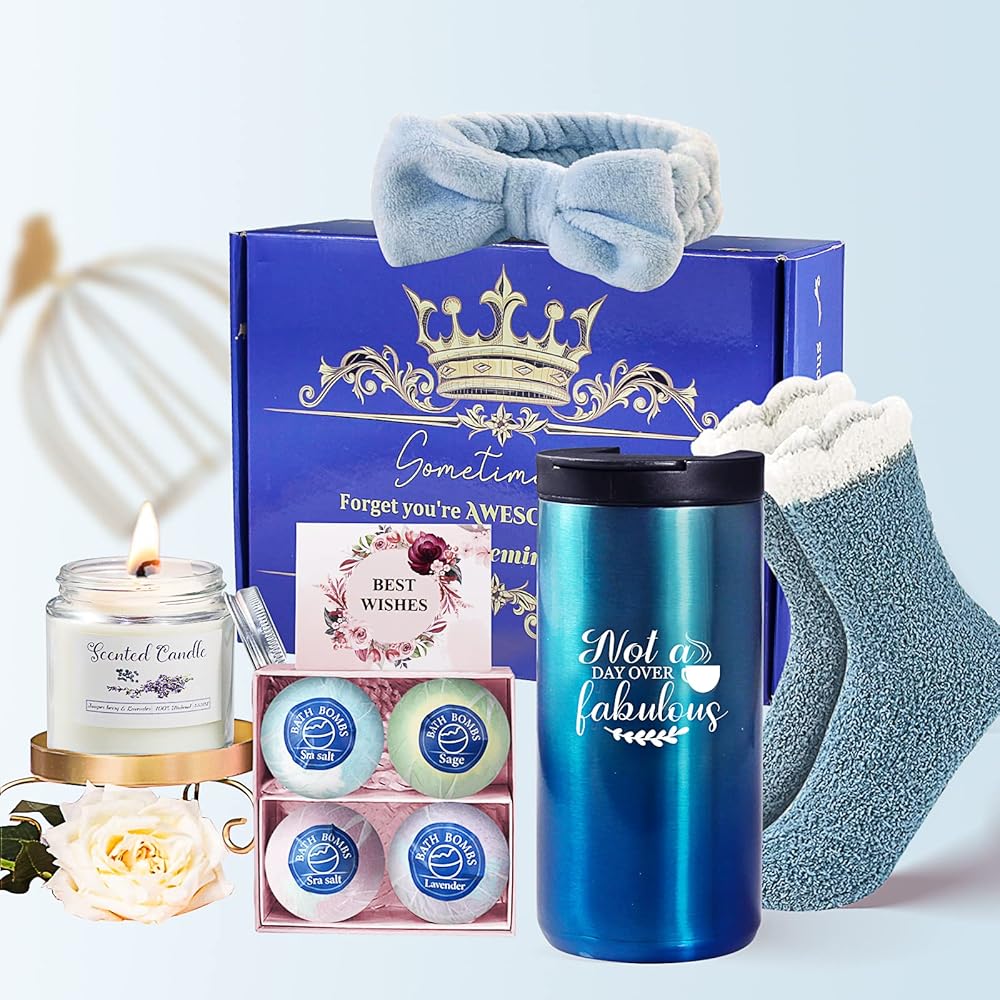 Gift Basket for Women-There are 12OZ personalized tumbler(Not A Day Over Fabulous) & customized scented candles(Juniper berry & Lavender),4PCS bath bombs, 1 pair fuzzy sock, 1PCS spa headband, 1 PCS greeting card and 1 gift box.
