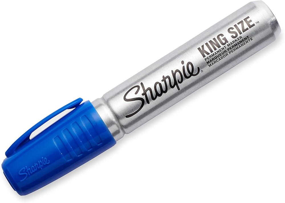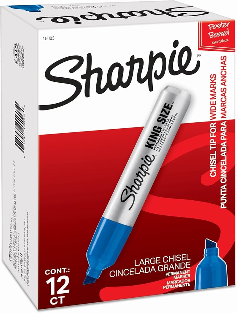 Sharpie 15003 King Size Permanent Marker, Red, 12-Pack. Felt chisel tip draws extra wide lines highly visible on corrugate, wood, metal, foil, stone, plastic and leather. Also works on wet or oily surfaces. Large ink supply for long-lasting, heavy-duty use. Water-resistant, non-toxic ink. Contains 12 markers. 0.625 inches long by 3.75 inches wide by 7.625 inches high. 0.128 pounds. Made in the USA.