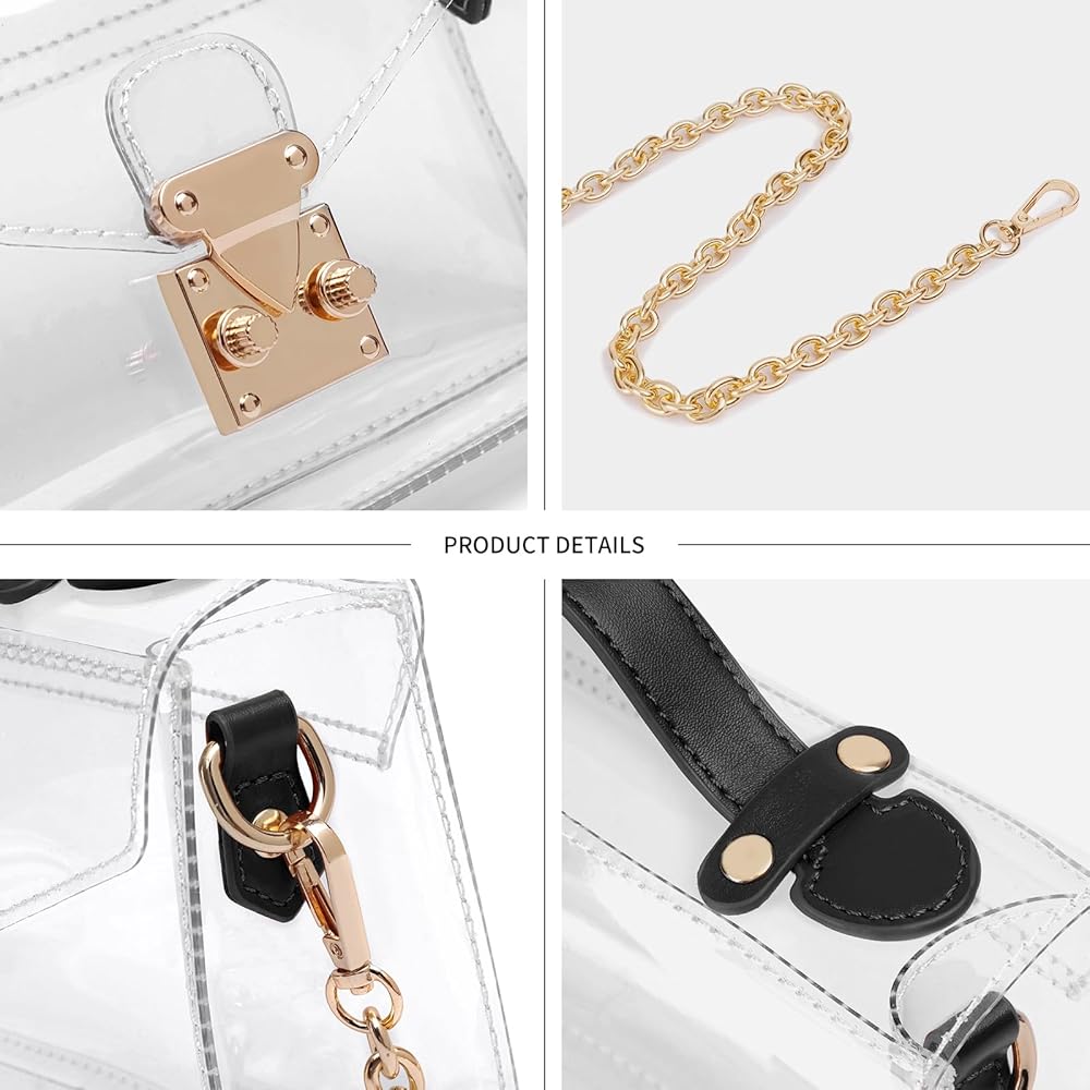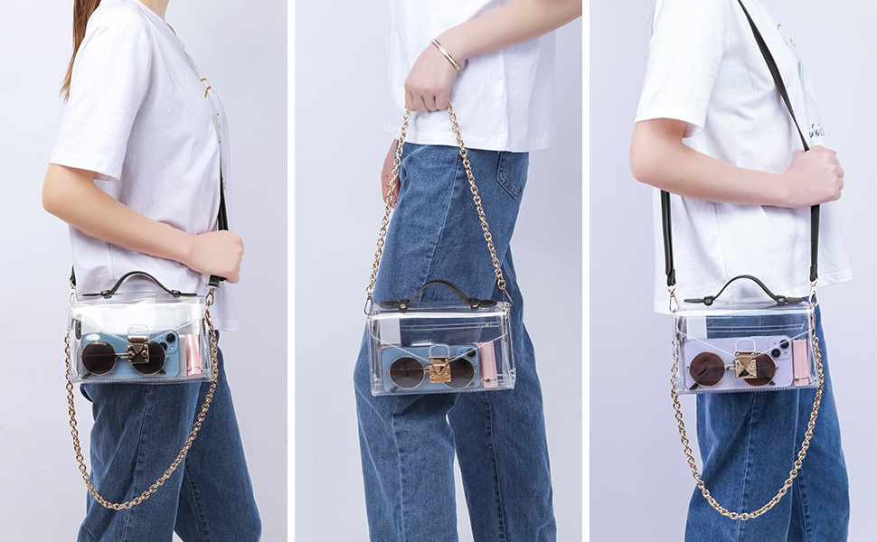 • Fashion Design: This cute clear plastic purse is trendy & generous design, flap top with push lock, exquisite hardware, a long adjustable shoulder strap and metal chain