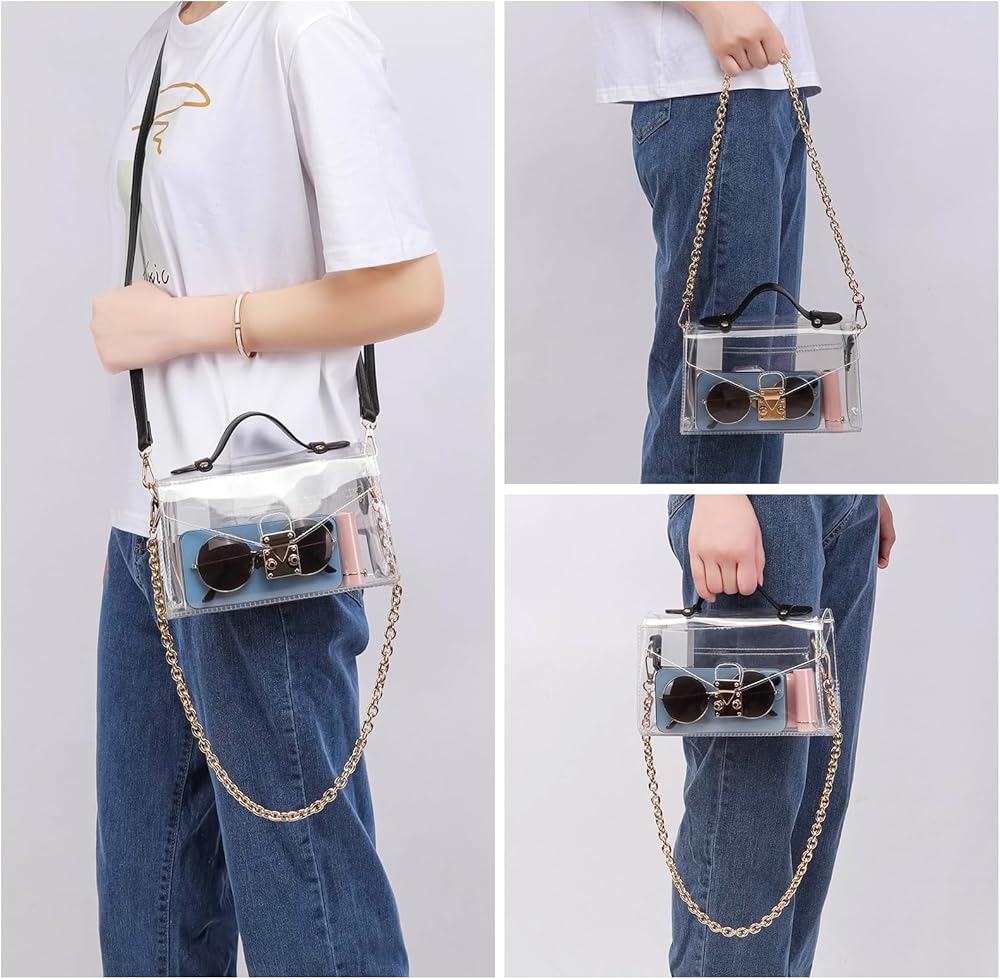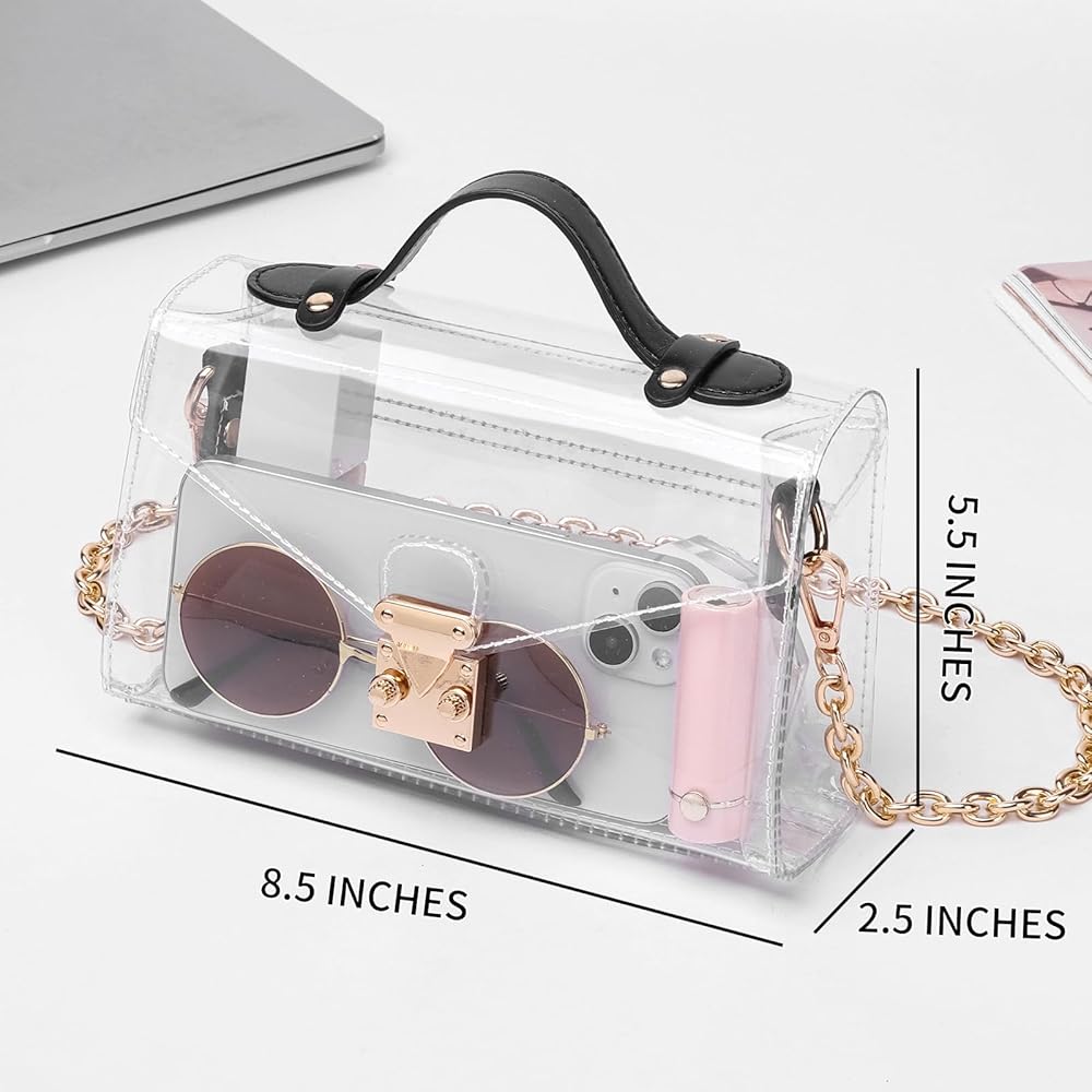 • Decent room: The clear crossbody bag size is 8.5x5.5x2.5 inches, providing enough space for your phone, small wallet, cards, cash, keys, lipsticks, sunglasses and perfume