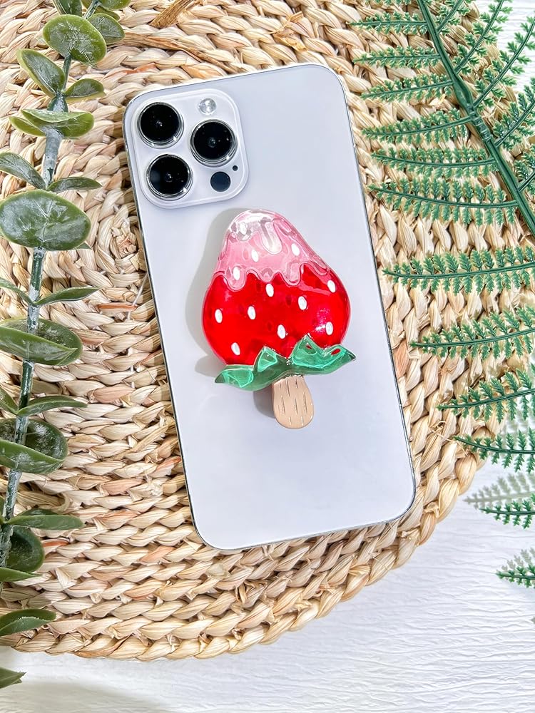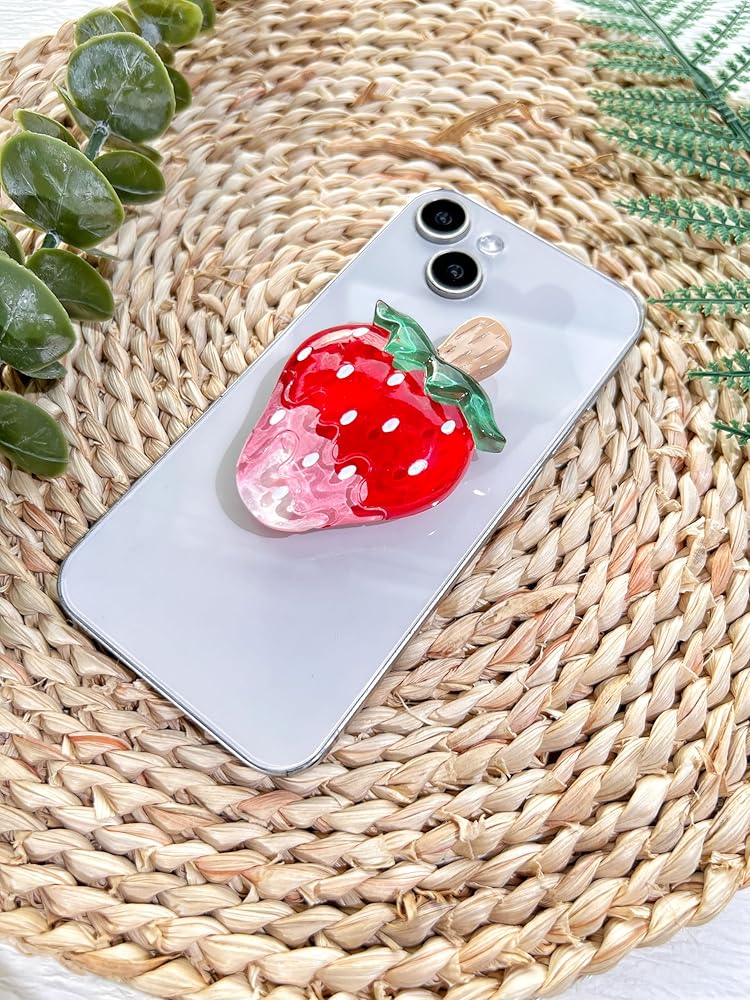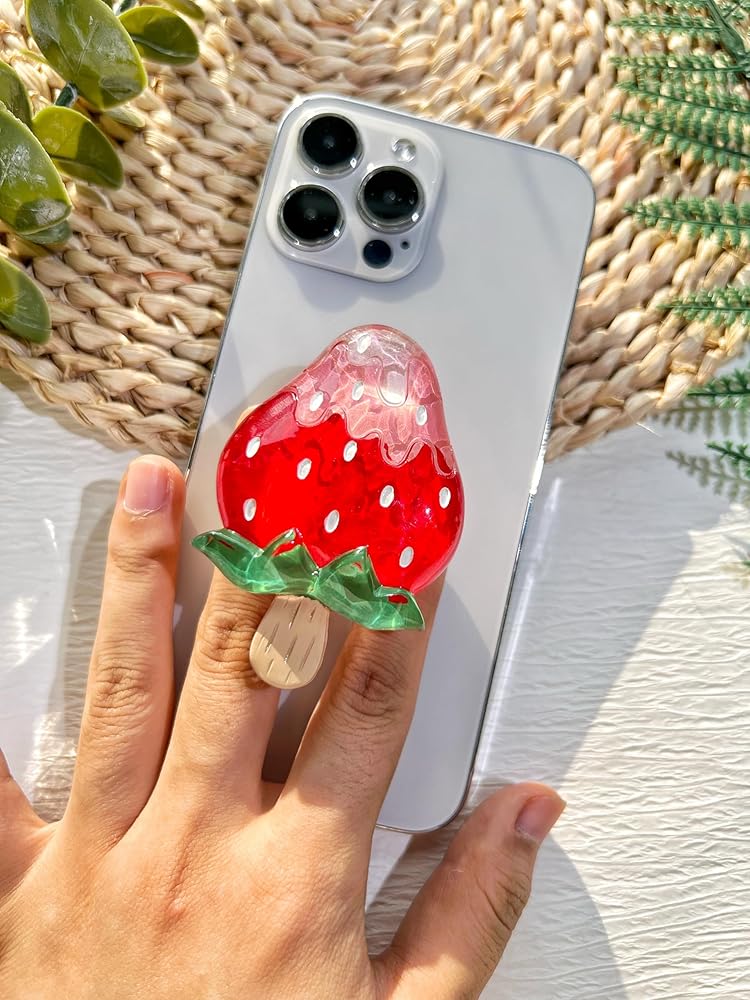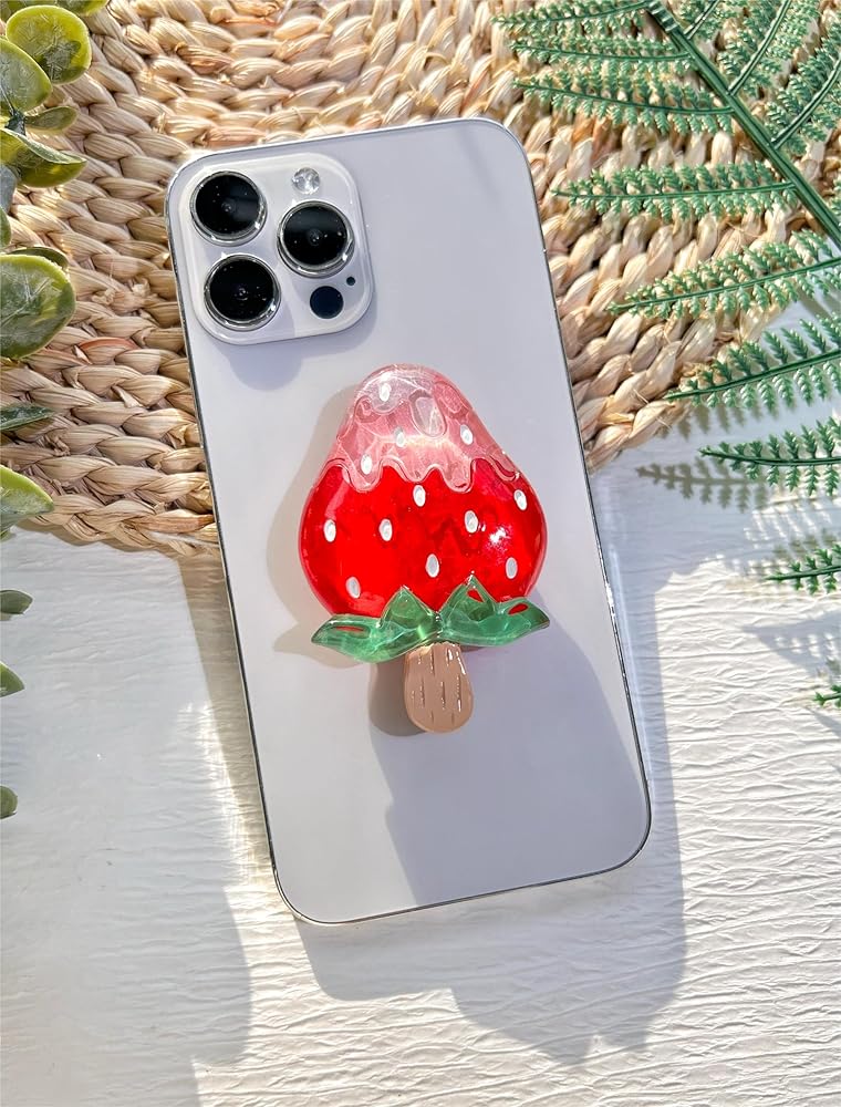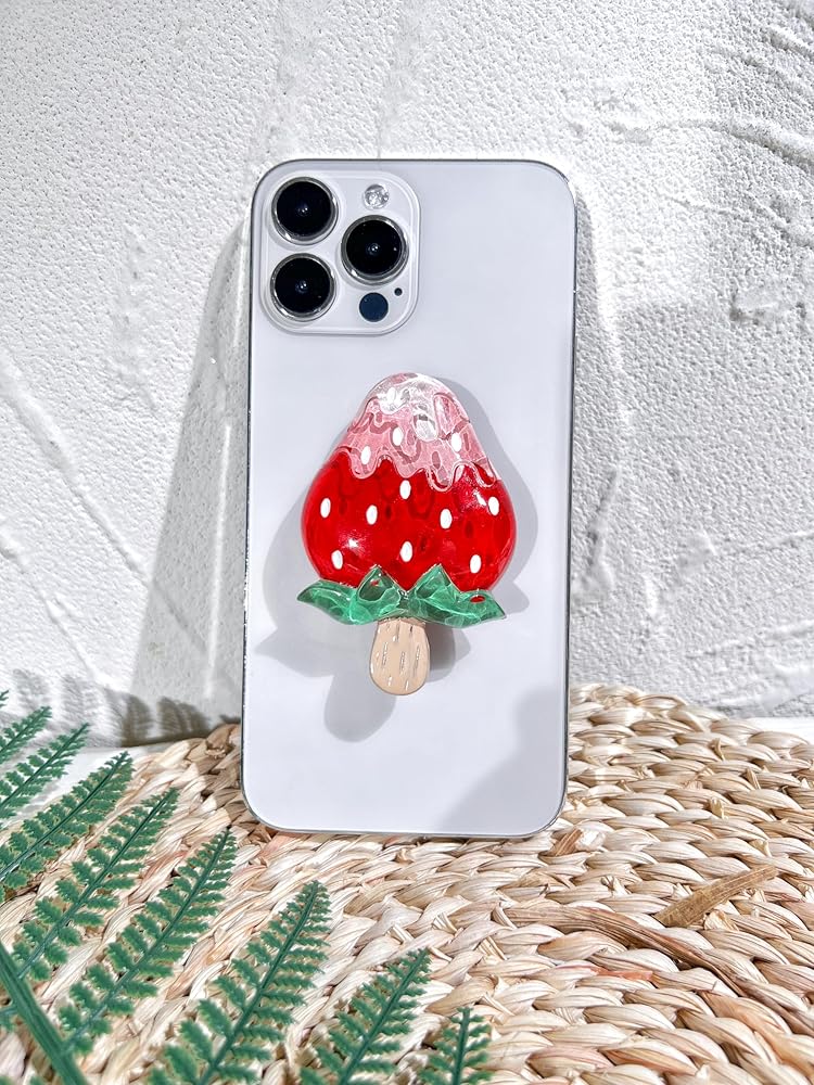 حامل قبضة هاتف على شكل فراولة لطيف من VJQ، حامل هاتف خلوي ثلاثي الأبعاد فريد من نوعه، ملحق سحر الهاتف قابل للطي، قبضة هاتف بمسند ممتد مع قاعدة قابلة للتبديل، مقبض قبضة لجهاز Kindle