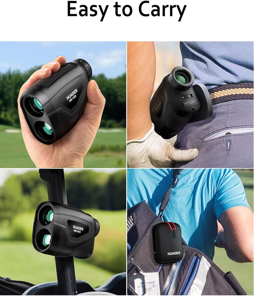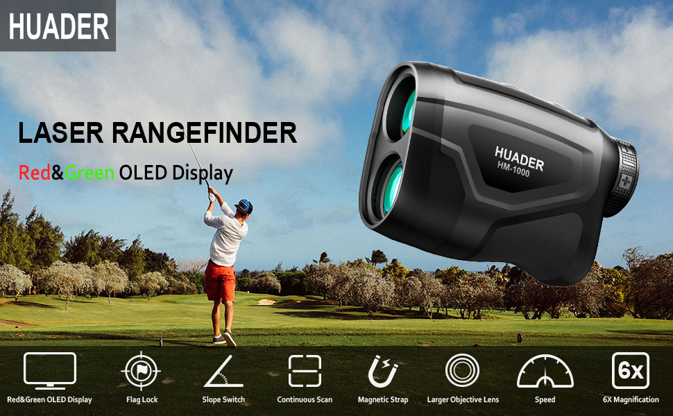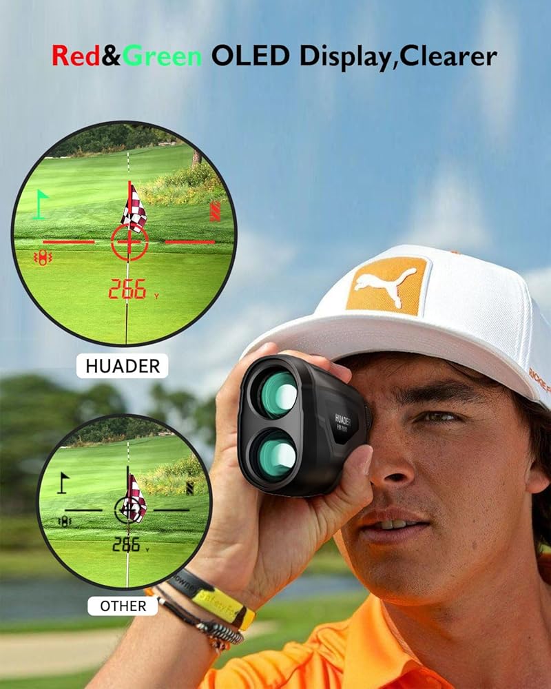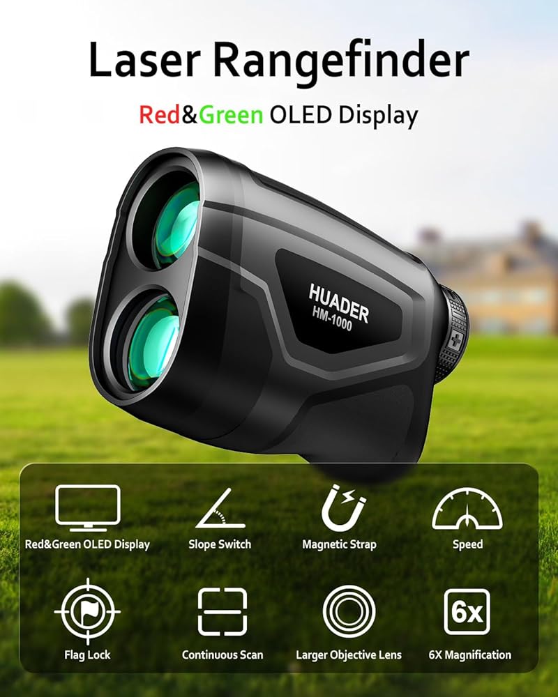 محدد نطاق الجولف HUADER مع مفتاح منحدر، جهاز تحديد نطاق الليزر بشاشة OLED باللون الأحمر/الأخضر مع دقة عالية، شريط مغناطيسي، اهتزاز قفل سارية العلم، قابل لإعادة الشحن، مكتشف نطاق 1093 ياردة للصيد