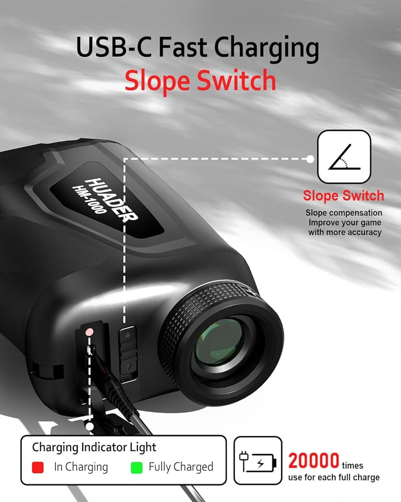 • ⛳️ 【أداة تحديد مدى المسافة سهلة الاستخدام】 بطارية قابلة لإعادة الشحن بقدرة 750 مللي أمبير في الساعة تدعم قياسات 20,000 مرة عند الشحن الكامل. التحمل وصديقة للبيئة. مزود بكابل شحن من النوع C يمكن توصيله بمحطة الطاقة المحمولة/بنك الشحن.