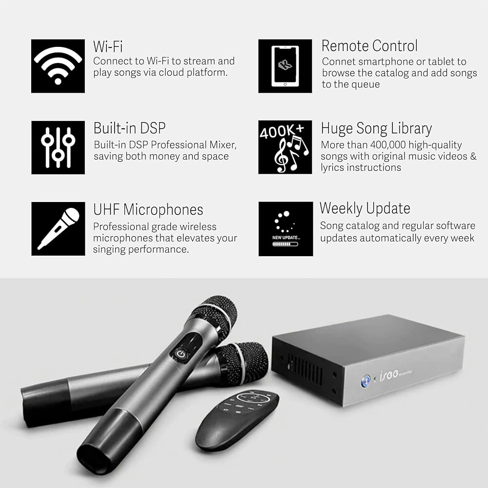 الإعداد السهل: إنه نظام كاريوكي من الجيل التالي يتيح لك التحكم من هاتفك الذكي أو جهازك اللوحي. يمكنك غناء أغاني الكاريوكي المفضلة لديك مباشرة من التلفزيون ومكبرات الصوت عبر كابل HDMI وRCA.