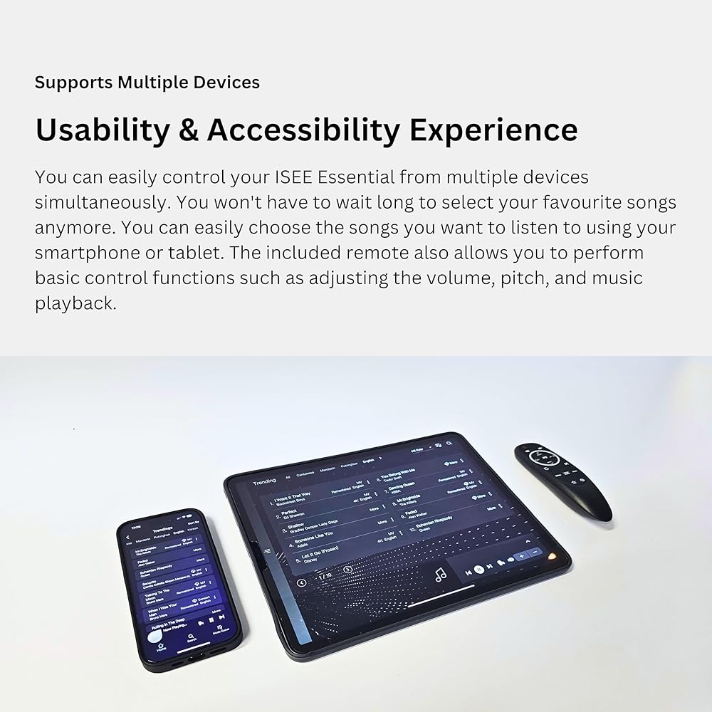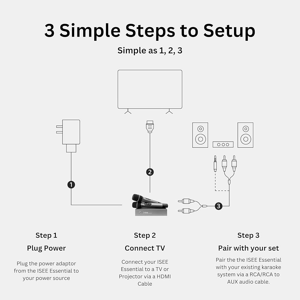 ***يرجى ملاحظة أنك بحاجة إلى شراء بطاريات لكل من جهاز التحكم عن بعد (بطاريتان AAA) والميكروفون (بطاريتان AA) بنفسك، ولا تأتي العبوة مع بطاريات. *** ويتطلب ISEE Essential شاشة HDMI لإخراج الفيديو؛ ومنافذ AUX/OPT الموجودة على أجهزة الصوت (مكبرات الصوت/مكبرات الصوت) لإخراج الصوت.***