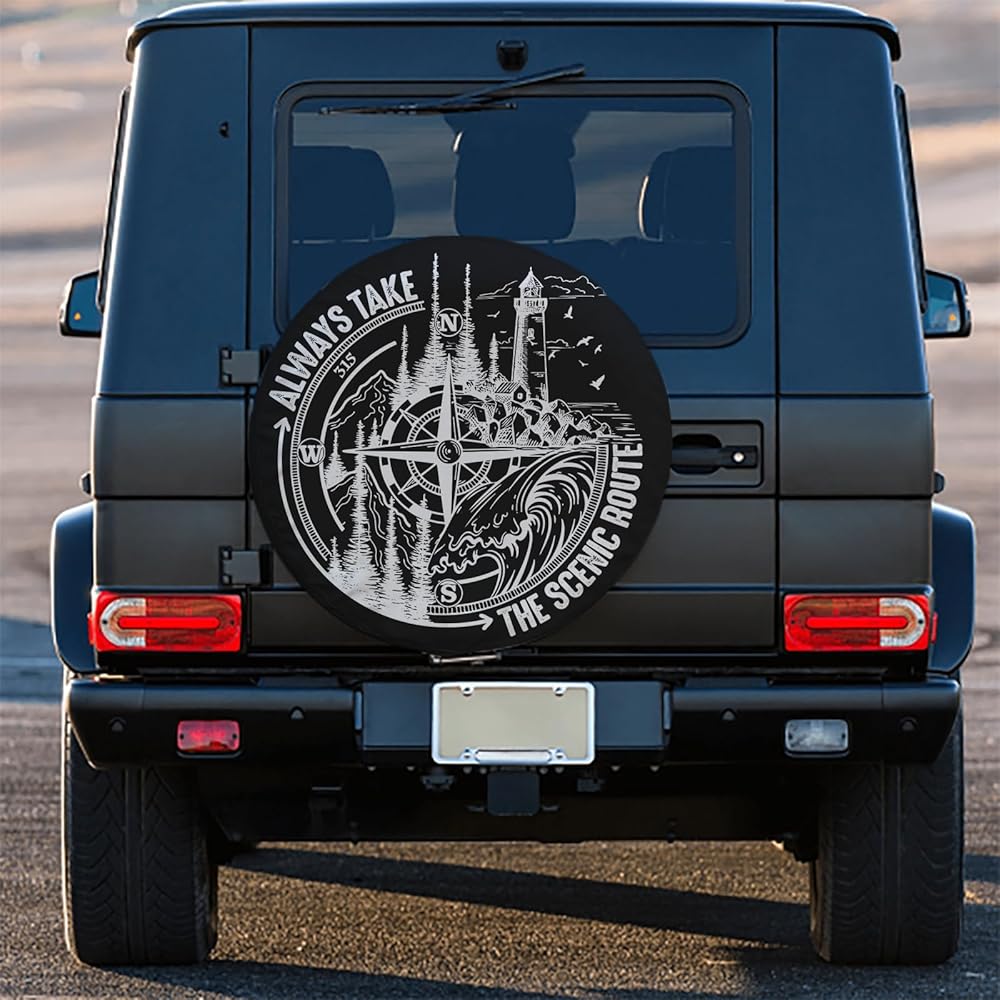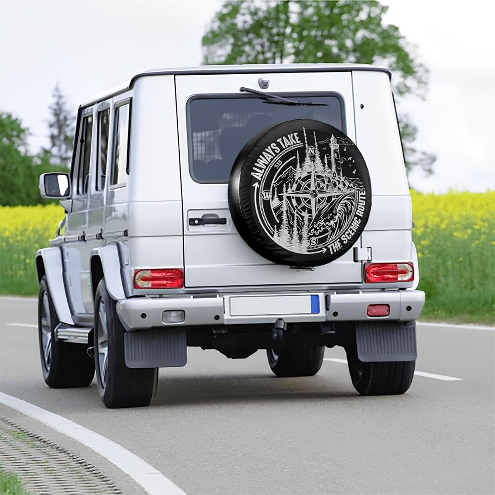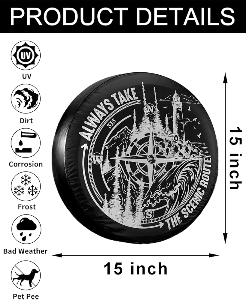 Embark on your next adventure with confidence using our Camper Spare Tire Cover. Designed to accommodate standard 15-inch wheels, this cover offers the perfect blend of style and protection. The scenic route compass motif invites you to take the road less traveled, while the robust PVC leather guards against water, dirt, and UV rays. This cover isn't just functional; it's also a statement piece that complements your adventurous spirit. The black and white design stands out, signaling your readiness for new experiences. Its high-quality construction ensures lasting durability, while the easy-to-install elastic hem means you're ready to hit the road after a simple setup. Whether it's a weekend getaway or a cross-country trek, this spare tire cover is an essential accessory for your traveling needs. Protect your spare tire and do it in style, ready for whatever the journey brings your way.