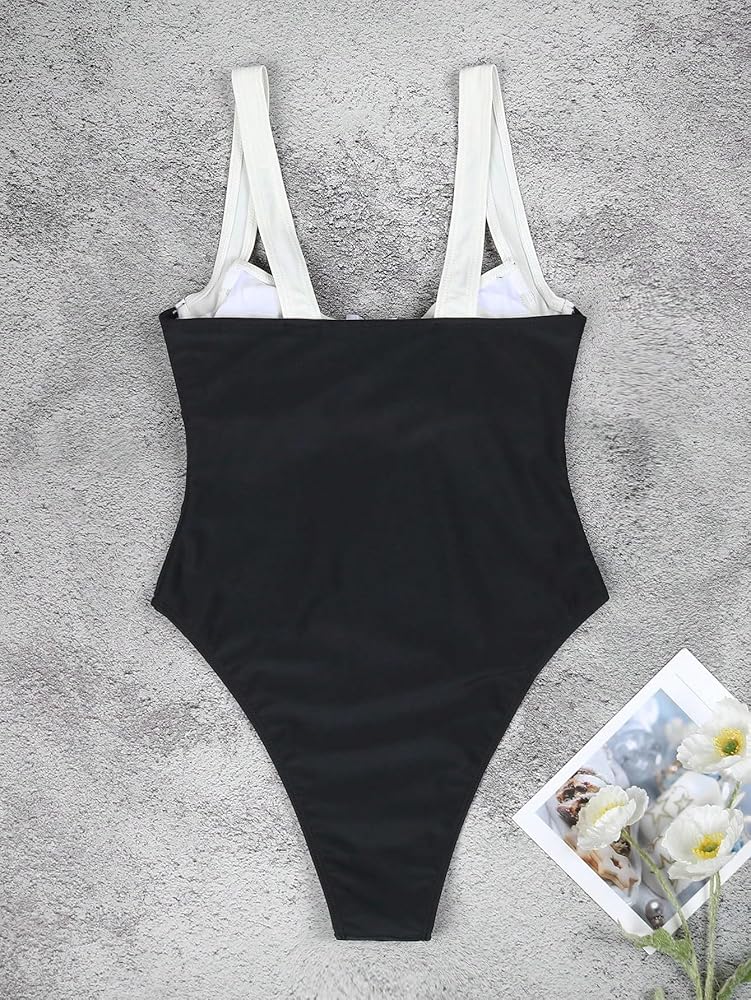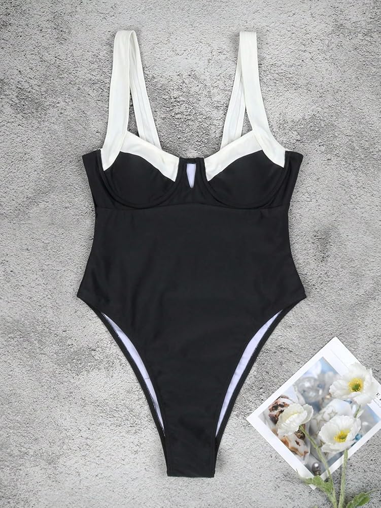 - Features: Two tone, contrast binding, high cut, push up, straps, sleeveless, one piece swimwear for women, fashionable
