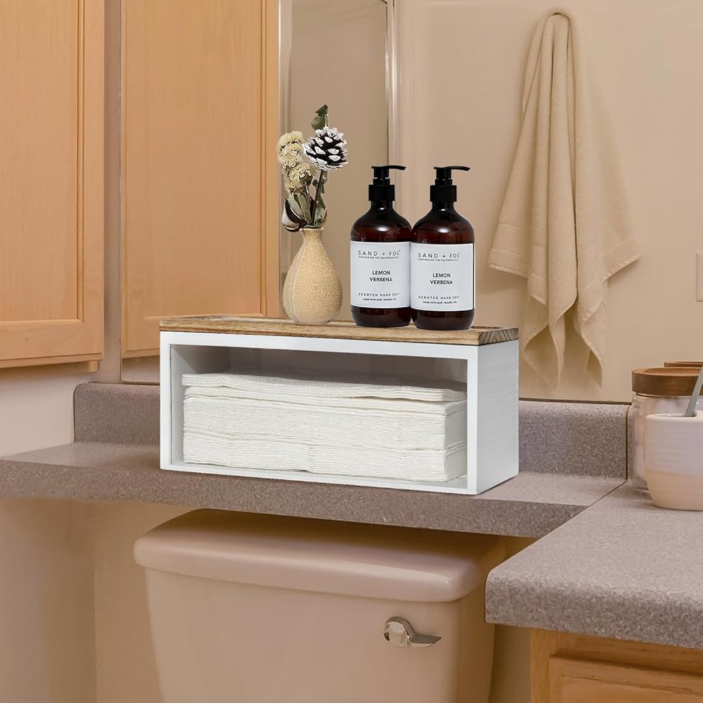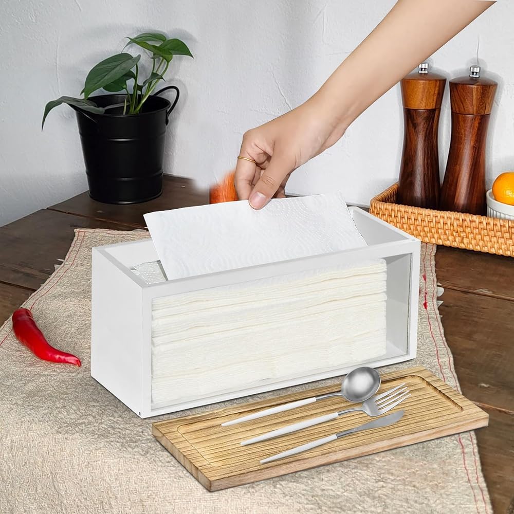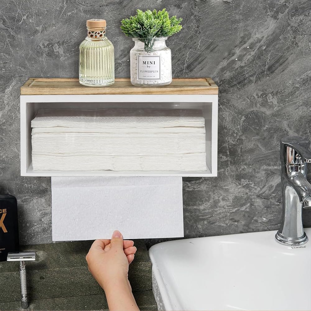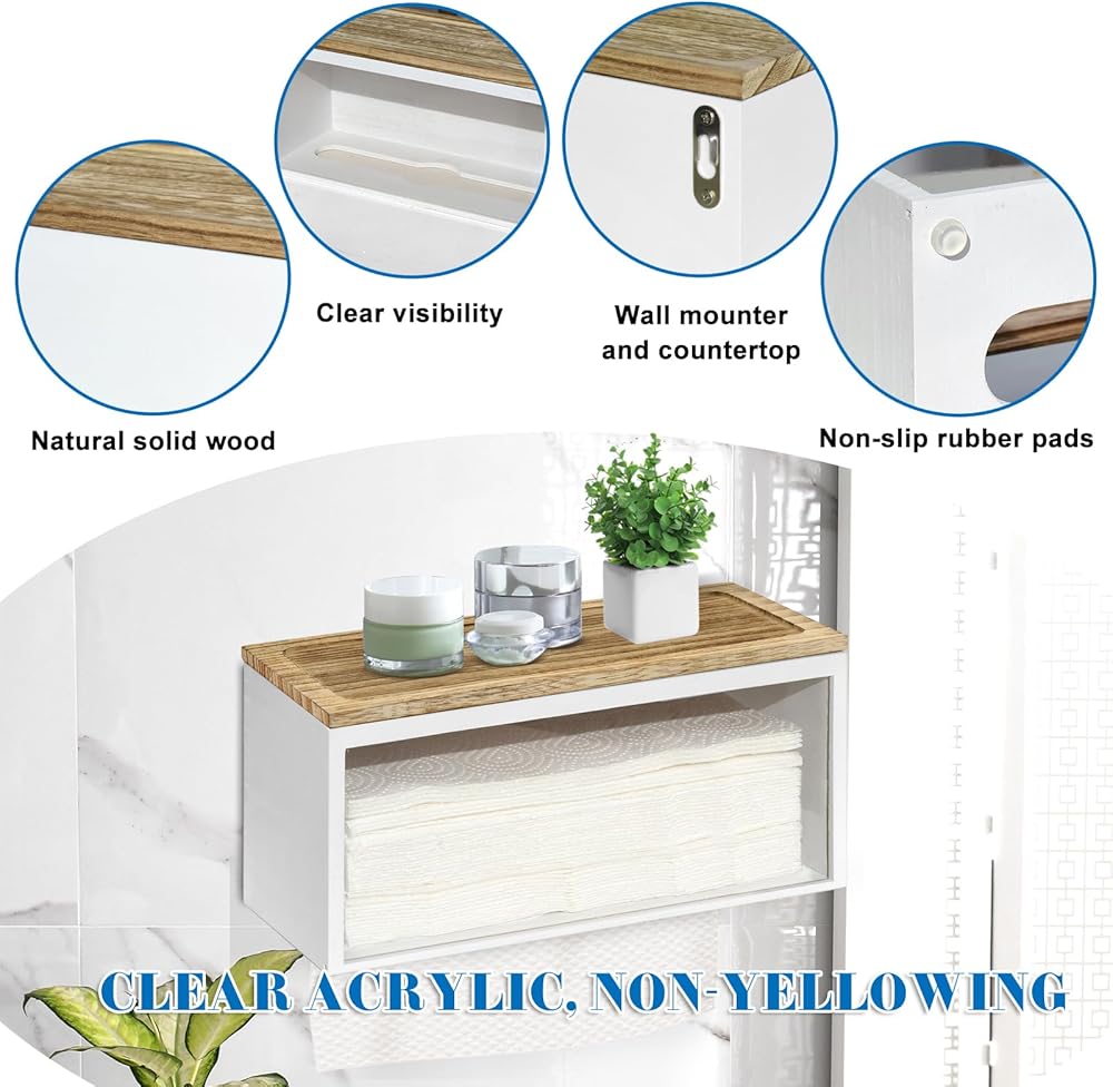 STURDY AND DURABLE BATHROOM PAPER TOWEL HOLDER: This farmhouse wall-mounted paper towel holder is made of high-quality solid wood with a food-grade safety coating, odorless, and safe for storing kitchen and bathroom C-fold, Z-fold, tri-fold towels, kitchen paper, and napkins. The front panel of the paper towel dispenser is made of thickened acrylic material, durable and not easy to break, the transparent design allows you to clearly see the remaining portion for easy refilling.