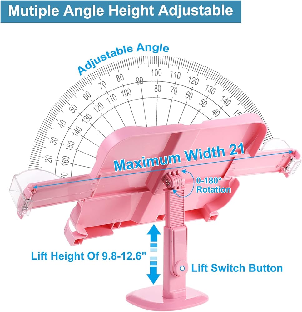 حامل كتب دوار 180 درجة - يمكن تدوير حامل الكتب الخاص بنا للمكتب 180 درجة في الأسفل. يحتوي الجزء الخلفي من حامل القراءة على زر لضبط الارتفاع مع نطاق تعديل الارتفاع من 9.8 بوصة إلى 12.6 بوصة، ويمكن تعديل حامل الكتب للقراءة بسهولة على ارتفاعات مختلفة. إنه يرفع جهازك عن الطاولة مع توفير مساحة للوحة المفاتيح والعناصر الأخرى.