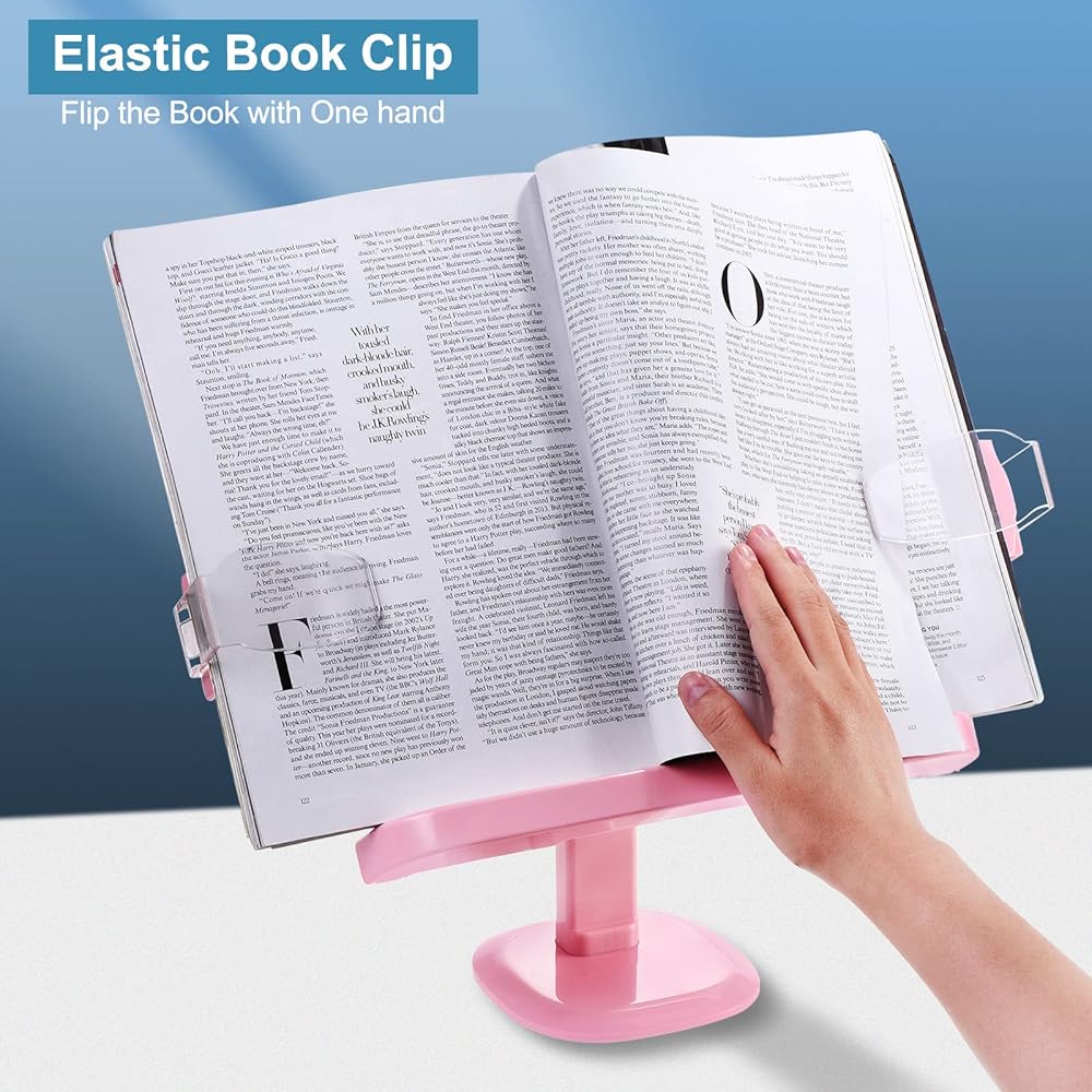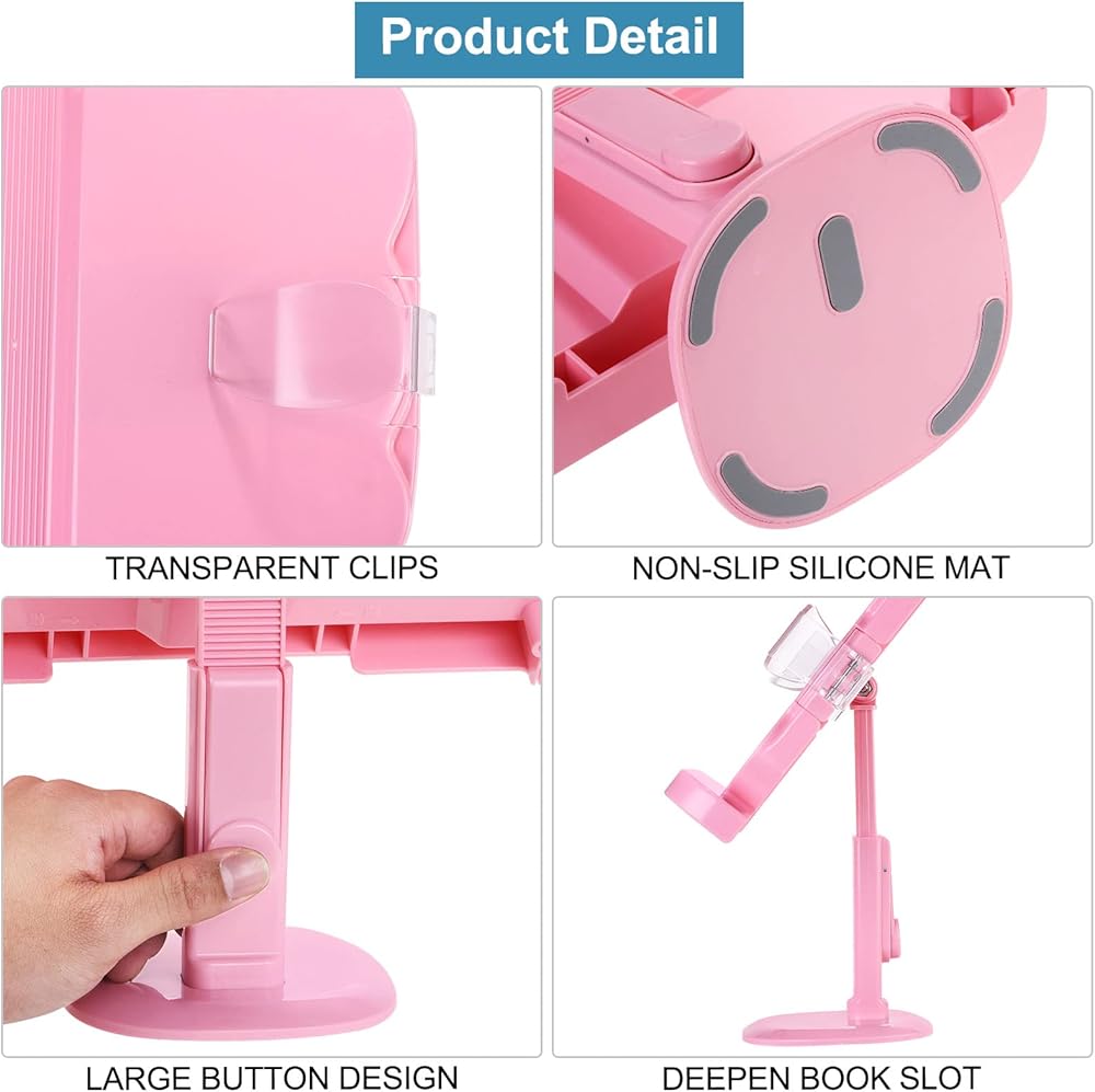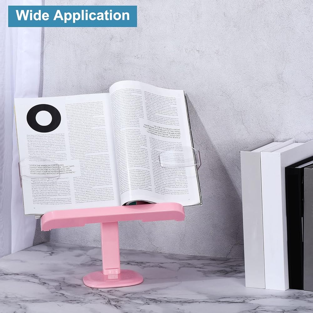 مشابك صفحات الكتاب - يأتي حامل الكتب مع مشبكين من البلاستيك للكتب. يمكن لمشبك الكتاب أن يطلق يديك ويثبت الصفحات عند قراءة الكتب. عندما تكتب في المكتب، يمكن أن يدعم الجزء الخلفي من المشبك الطاولة ويمنع اهتزاز الكتابة.