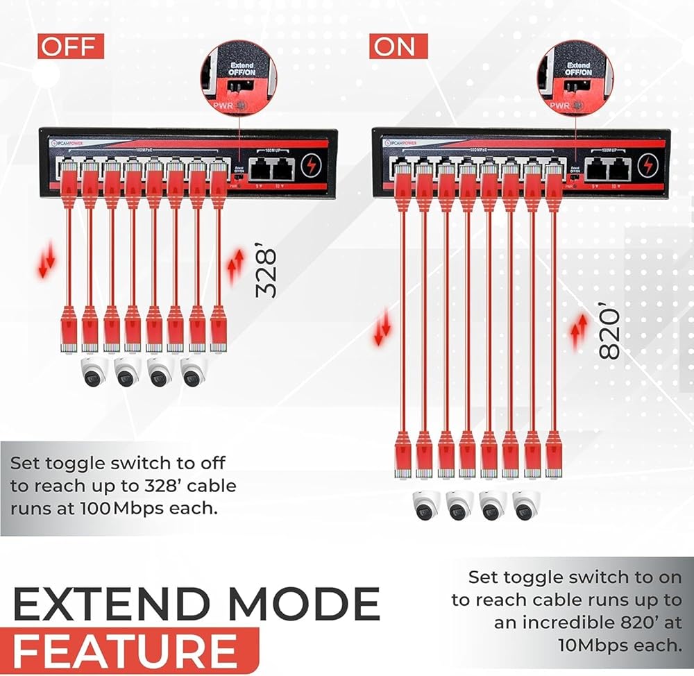 EXTEND MODE ALLOWS FOR UP TO 820' CABLE RUNS - The switch offers an "Extend Mode" feature, enabling cable runs up to 820 feet (250 meters) at 10Mbps on ports 1-4. This unique feature allows for the deployment of devices well beyond the standard 328' cable length limitations, providing both power and data over extended distances.