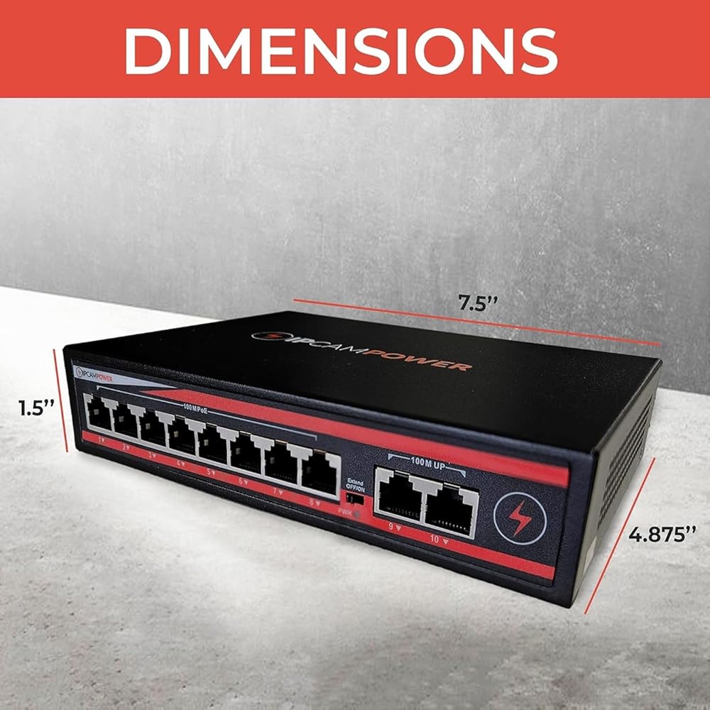 Our advanced 6-Port 10/100 Mbps Switch is the perfect blend of functionality and durability, designed to meet the demands of both residential and commercial environments. It features four PoE ports with 802.3af/at compatibility, ideal for powering devices such as IP cameras, phones, and access points, alongside two non-PoE uplink ports for seamless integration with NVRs, servers, or routers. This switch stands out with its capability to deliver up to 30 watts per port under the 802.3at PoE+ standard, with a total power budget of 60 watts, ensuring it can support a wide range of devices from power-hungry to those requiring minimal power, while maintaining backward compatibility with 802.3af devices. The unique "Extend Mode" enables cable runs up to 820 feet at 10Mbps on ports 1-4, allowing for the deployment of end devices beyond standard distance limitations without sacrificing power or data efficiency. Crafted with a heavy-duty metal case and a fanless design, this switch is built to last, featuring an integrated power supply that eliminates the need for bulky external adapters and a high temperature tolerance (14-140°F) to ensure reliable operation under various conditions. It comes with a one-year warranty from a reputable USA-based brand, offering peace of mind and reliable customer support, making it a secure and valuable investment for any networking project.