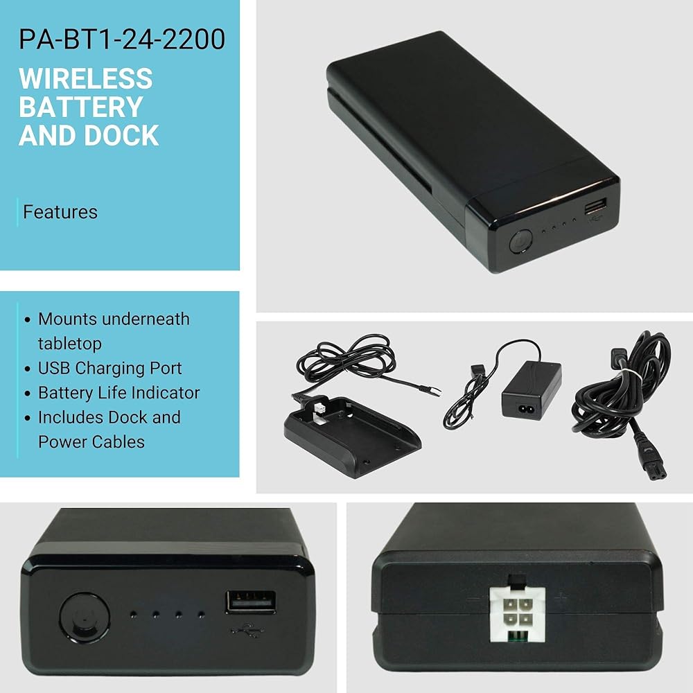 The PA-BT1-24-2200 battery has been designed to keep your application running, even while on the move or when you don't have access to an alternative power output. It is the ultimate power source for your application, without the limitations of cables or restrictive power outlets It supplies 24 VDC power to other 24 VDC controllers and actuators, including our FLTCON-2-24 VDC. Alongside these devices, it's also a convenient power supply for all of our standing desks, allowing you to adjust your desk regularly without the need for charging, thanks to the 2.2Ah capacity. Alongside the battery itself comes a dock, charger, AC power cable, and screws for mounting the dock.