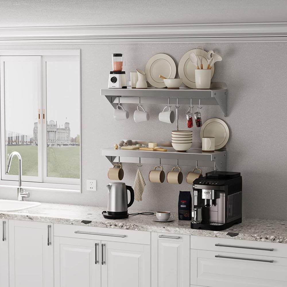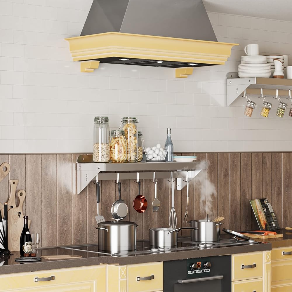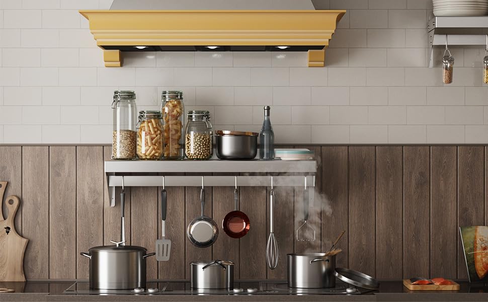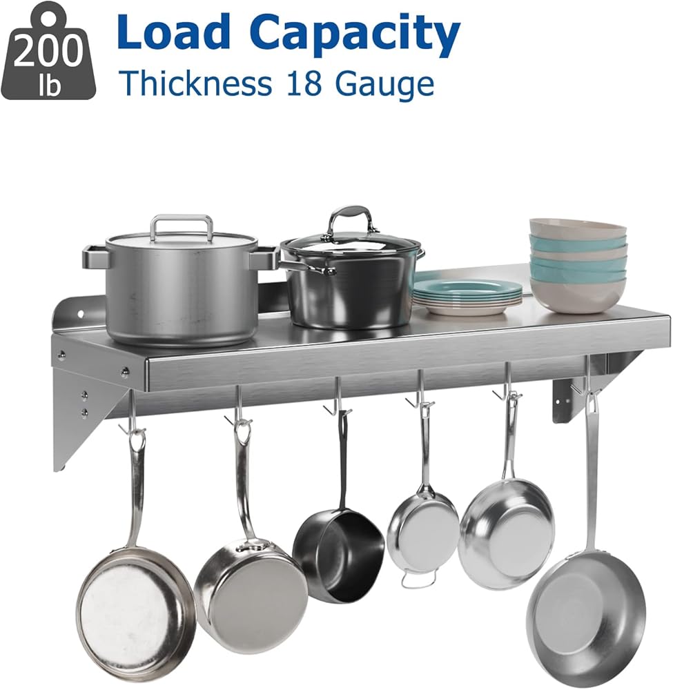 【High Load capacity】:The stainless steel shelf with 6 hooks is 200LBS,they can be used as kitchen shelves to hold pots,frying pans and other kitchen equipments.
