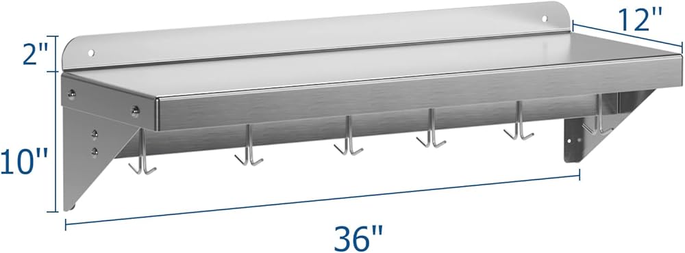 【Material and Size】:The stainless steel shelving is made of 18 gauge stainless steel,which ensures quality.Size:12"D x 36"W x 10"H