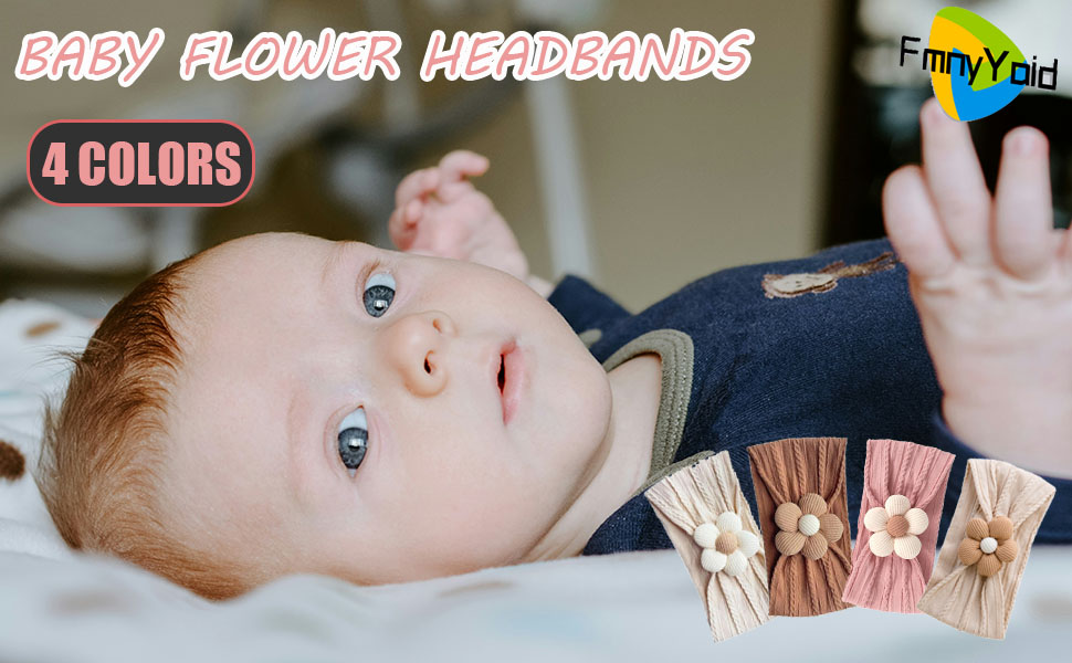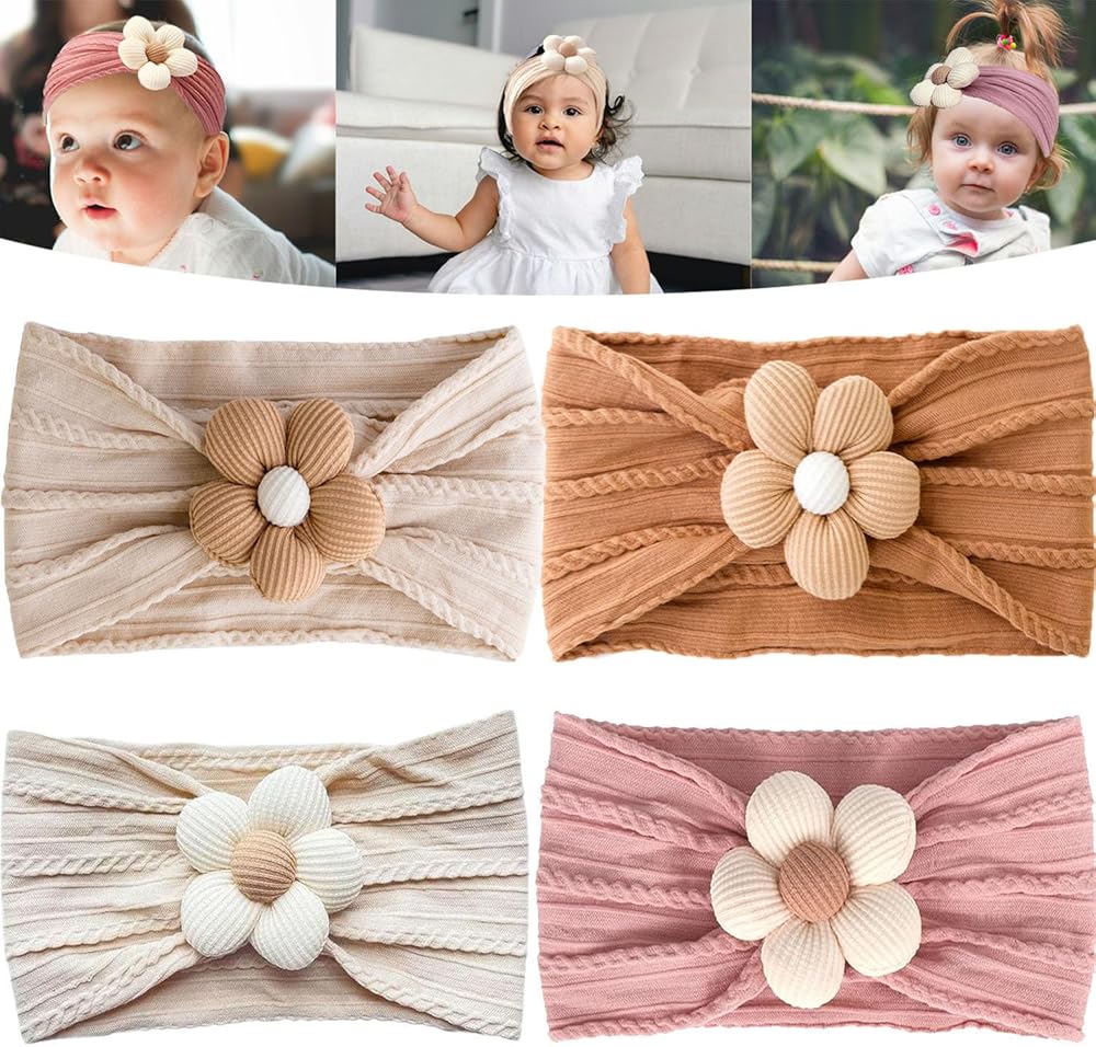 FmnyYaid 4 قطع عصابة رأس على شكل زهرة للأطفال، عصابات رأس من النايلون قابلة للتمدد للغاية للفتيات الصغيرات من النايلون، عصابات شعر ناعمة إكسسوارات للفتيات حديثي الولادة والرضع والأطفال الصغار