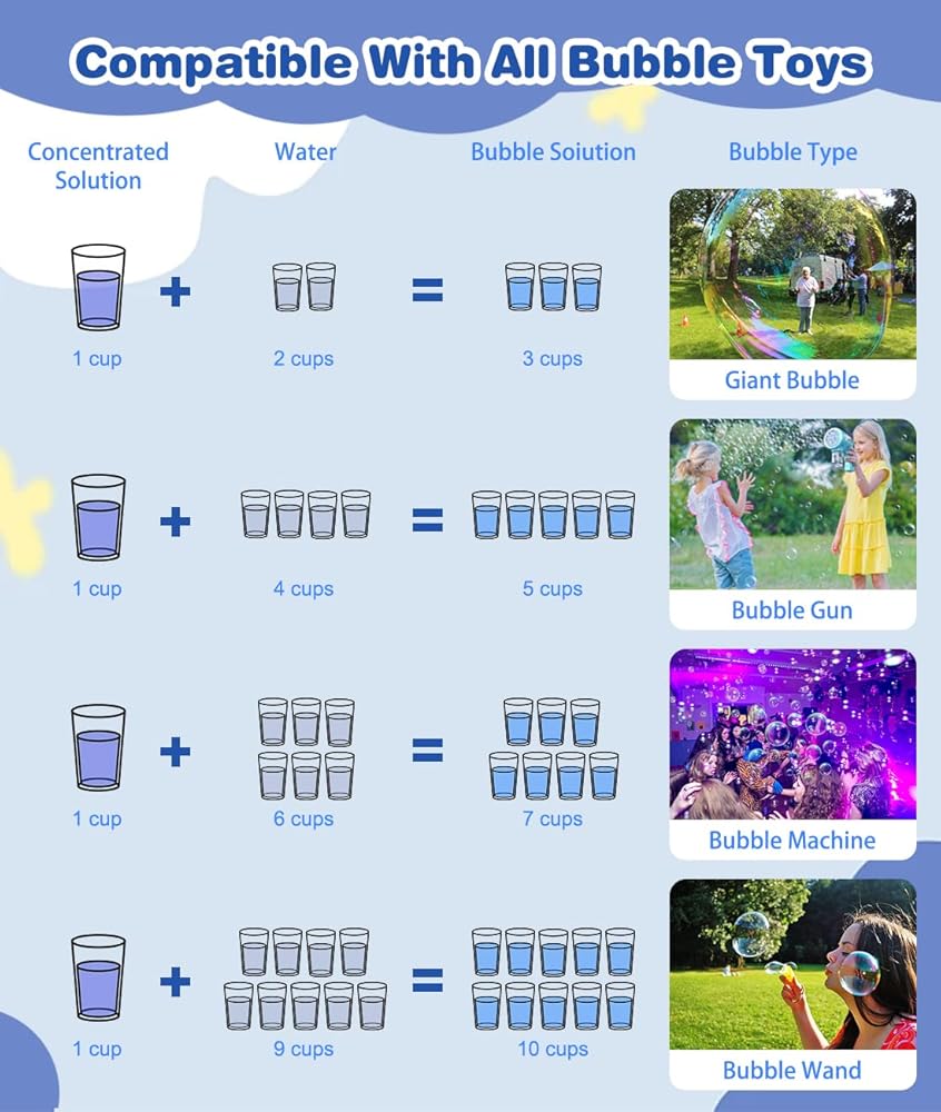 【Dilute with Water Before Use】 Different ratios will result in different bubbles. For example, 1 cup of concentrate + 2 cups of water = giant bubbles, 1 cup of concentrate + 4 cups of water = bubble gun, 1 cup of concentrate + 6 cups of water = bubble machine. (For more ratios, please refer to the picture or the product description below.)