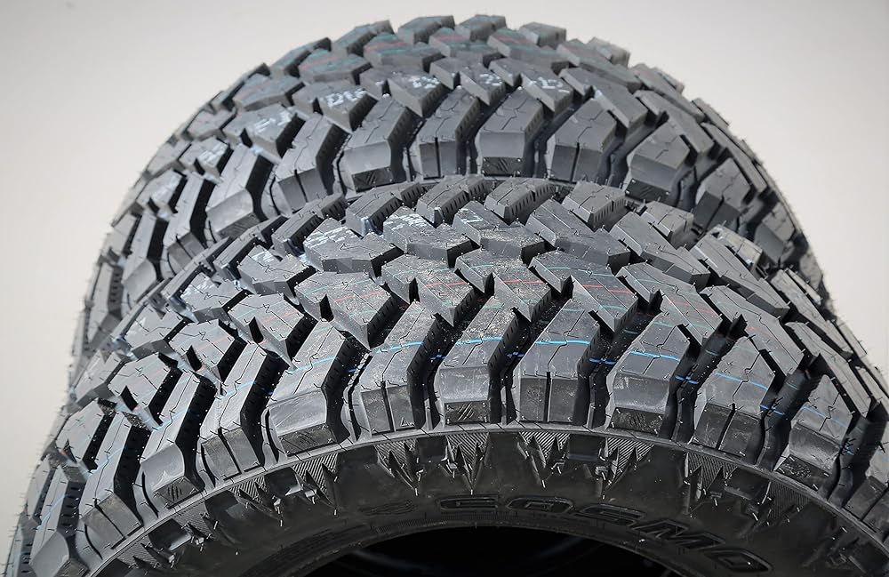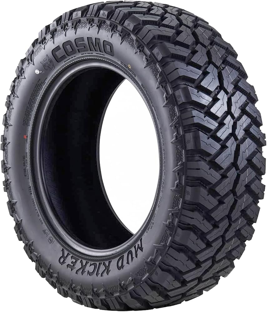 The Cosmo Mud Kicker is a mud terrain, all season tire manufactured for light trucks. The tire offers a phenomenal tread life thanks to its strong compound and self-cleaning tread design. They prevent irregular wear and protect the tire from damage, boosting its usability. It comes with reinforced structural materials that greatly improve its load durability. The tire is able to perform well in heavy-duty applications as a result. The aggressive tread, with high void ratio and staggered blocks, conquers various terrain surfaces with ease in order to maintain a constant forward motion all the time. This makes the Mud Kicker a perfect off-road tire model.