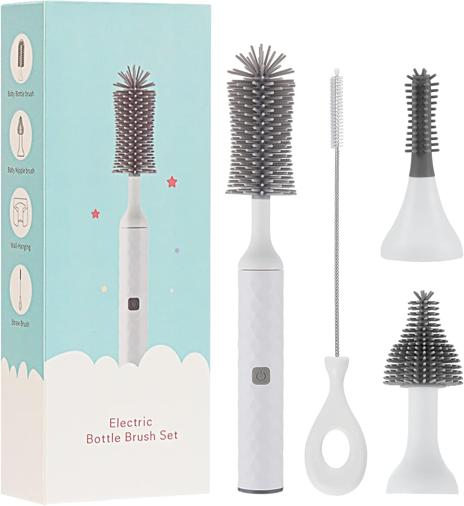 [فرشاة زجاجات كهربائية متعددة الوظائف] - مجموعة فرش الزجاجات مع فرشاة الزجاجات الكهربائية، وفرشاة الحلمة، وفرشاة تنظيف المصاصة؛ وهي مناسبة لتنظيف جميع أنواع زجاجات الأطفال، وزجاجة المياه، وزجاجة الحليب، واللهاية، والقش، إلخ.