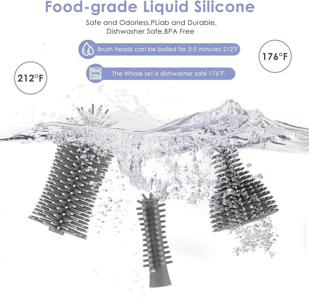 [مادة آمنة ومتينة] - مجموعة منظف زجاجات الأطفال مصنوعة من السيليكون السائل عالي الجودة عديم الرائحة ومادة أكريلونتريل بوتادين ستايرين الآمنة والبيئية، بدون مادة BPA. رؤوس الفرشاة آمنة للاستخدام في غسالة الأطباق ومناسبة للغليان.