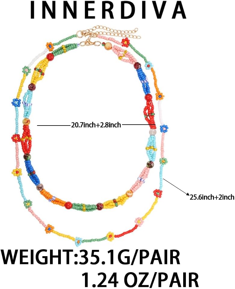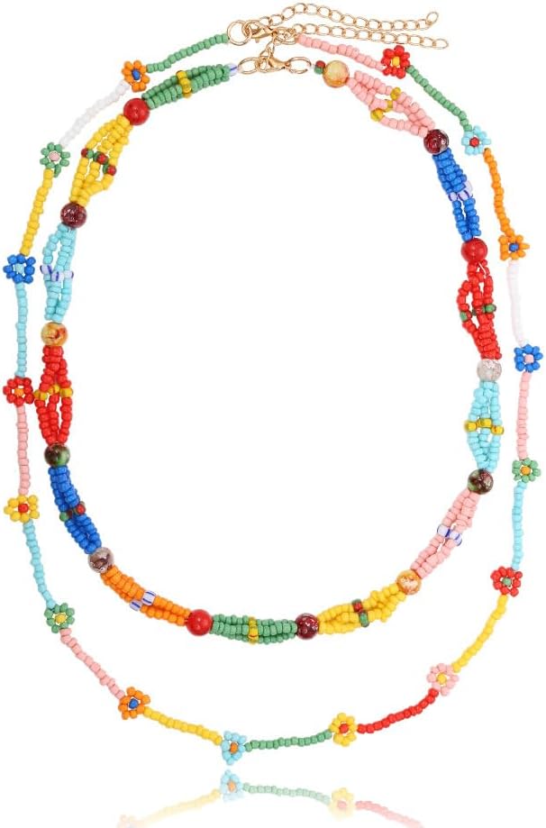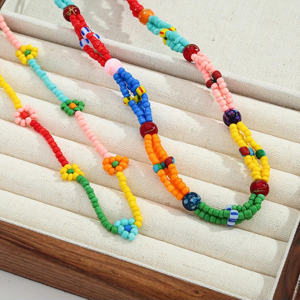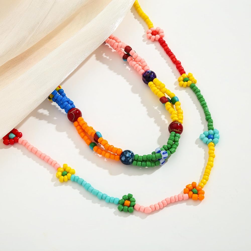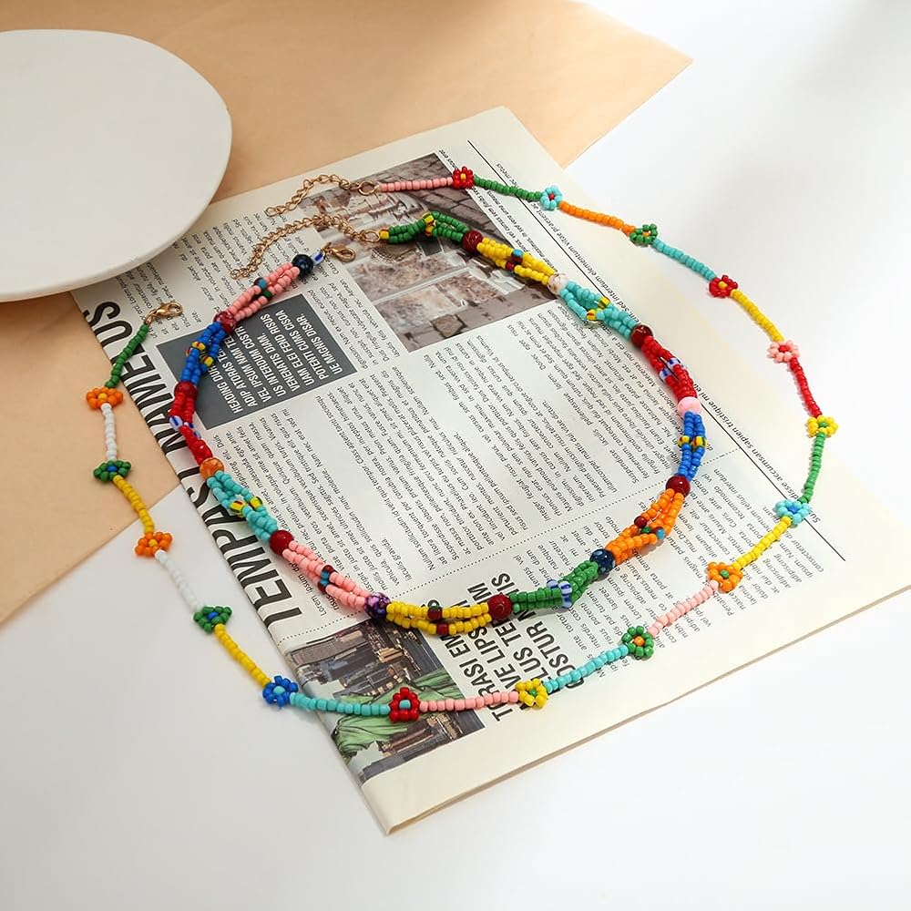 Our colorful beaded necklace boasts a vibrant and eye-catching design. Each layer features an assortment of beads in a rainbow of colors, including green, blue, red, yellow, pink, orange, and white, intricately arranged in flower shapes, adding a playful and whimsical touch to your look.