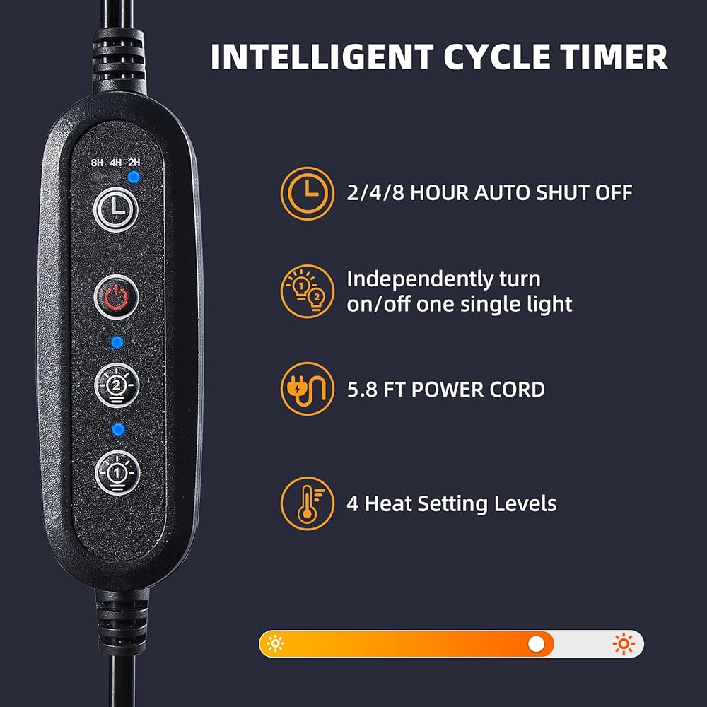 إعدادات التحكم والمؤقت المخصصة: يمكنك التحكم في عناصر التحكم المنفصلة لكل مصباح حراري، مما يسمح لك بإدارة مصباحين بشكل مستقل أو مزامنتهما. يوفر مؤقت الدورة المدمج فترات زمنية مريحة تبلغ 2 أو 4 أو 8 ساعات، مما يضمن التبديل التلقائي للتشغيل/الإيقاف بدون متاعب.