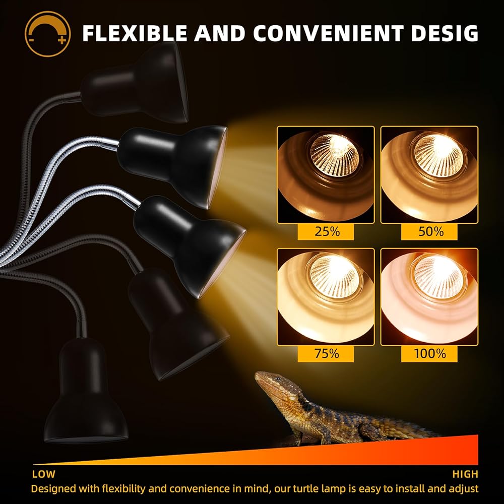 تصميم مرن على شكل رقبة الإوزة: قم بتوجيه الحرارة وضوء السلحفاة بسهولة حيث يحتاجها الزواحف الخاصة بك بشدة. يسمح التصميم المرن على شكل رقبة الإوزة بإجراء تعديلات دقيقة، مما يضمن حصول حيوانك الأليف على الدفء بالطريقة التي يفضلها تمامًا.