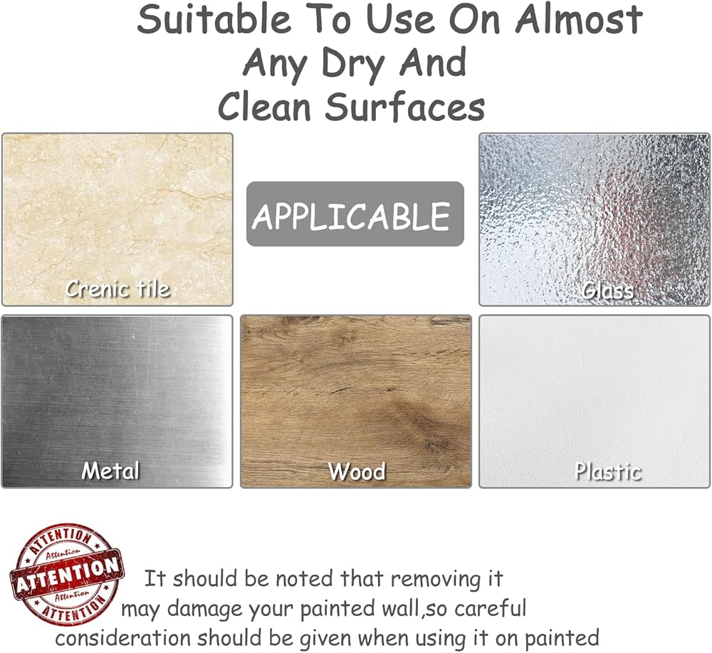 • Suitable for flat and smooth surfaces: plastic, glass, metal, wood, and ceramic tiles. Painted walls may peel off, please use with caution.