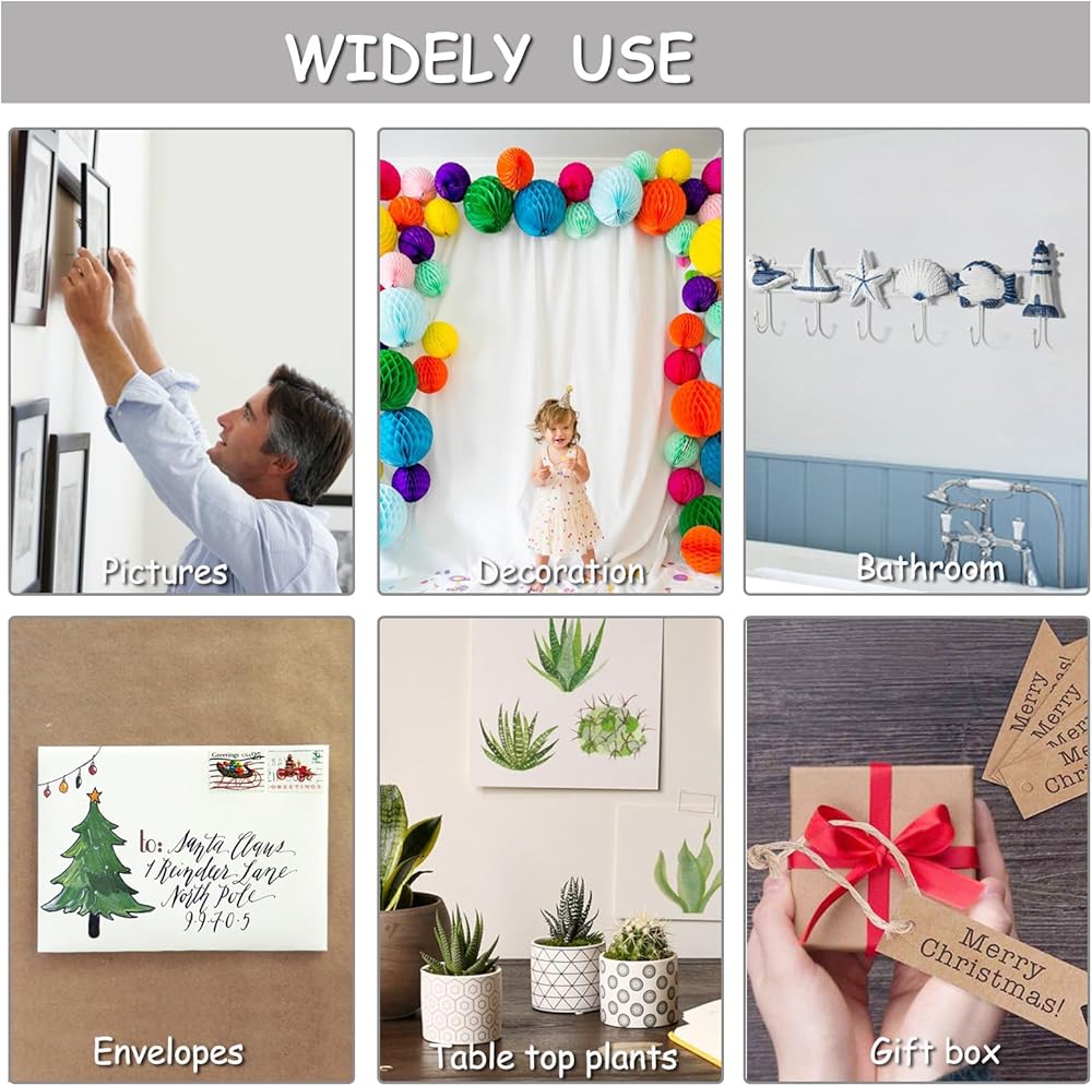 • Multipurpose tape can be used for hanging pictures, posters, and sockets to provide a home decoration and clean space. Can also use for crafting, gift wrapping, office, school, party wedding decorations and more.