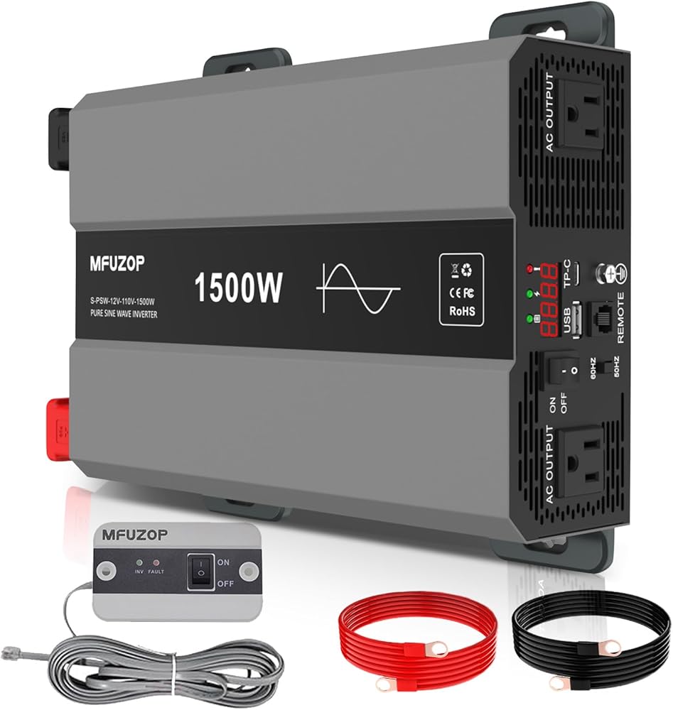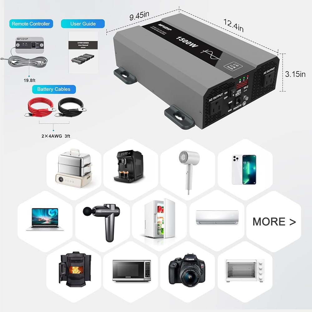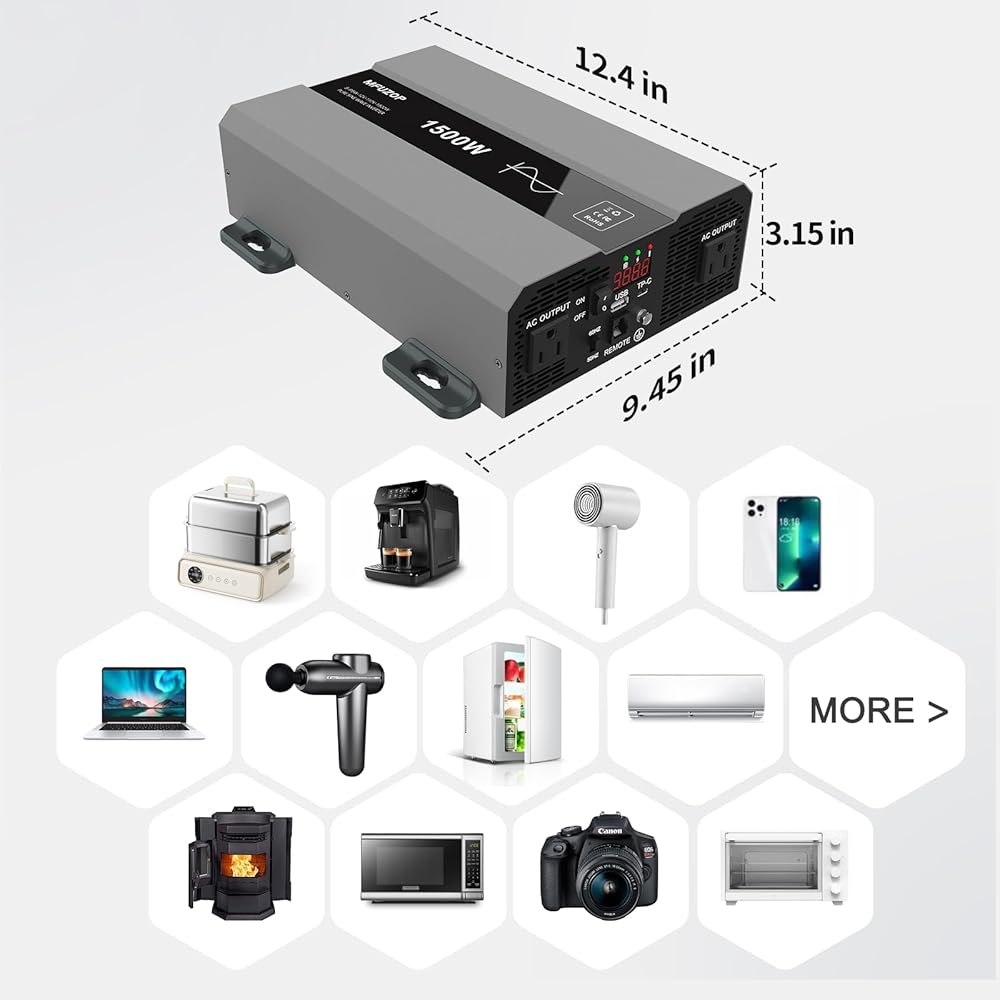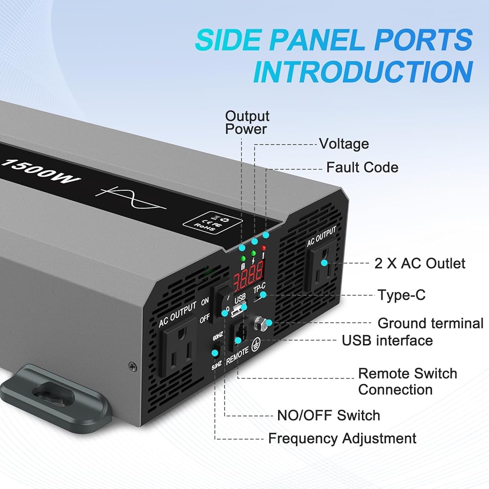 حماية شاملة للسلامة: محول موجة جيبية نقية من 12 فولت إلى 120 فولت تيار متردد مع حماية من قاطع دائرة الأعطال الأرضية (GFCI) و3 مصابيح مؤشر (الجهد الكهربي، طاقة الخرج، رمز الخطأ). إن استخدام جهاز التحكم عن بعد مع شاشة العرض يجعل من السهل معرفة حالة عمل العاكس في أي وقت، مما يضمن راحة البال من خلال المراقبة المستمرة للجهاز.