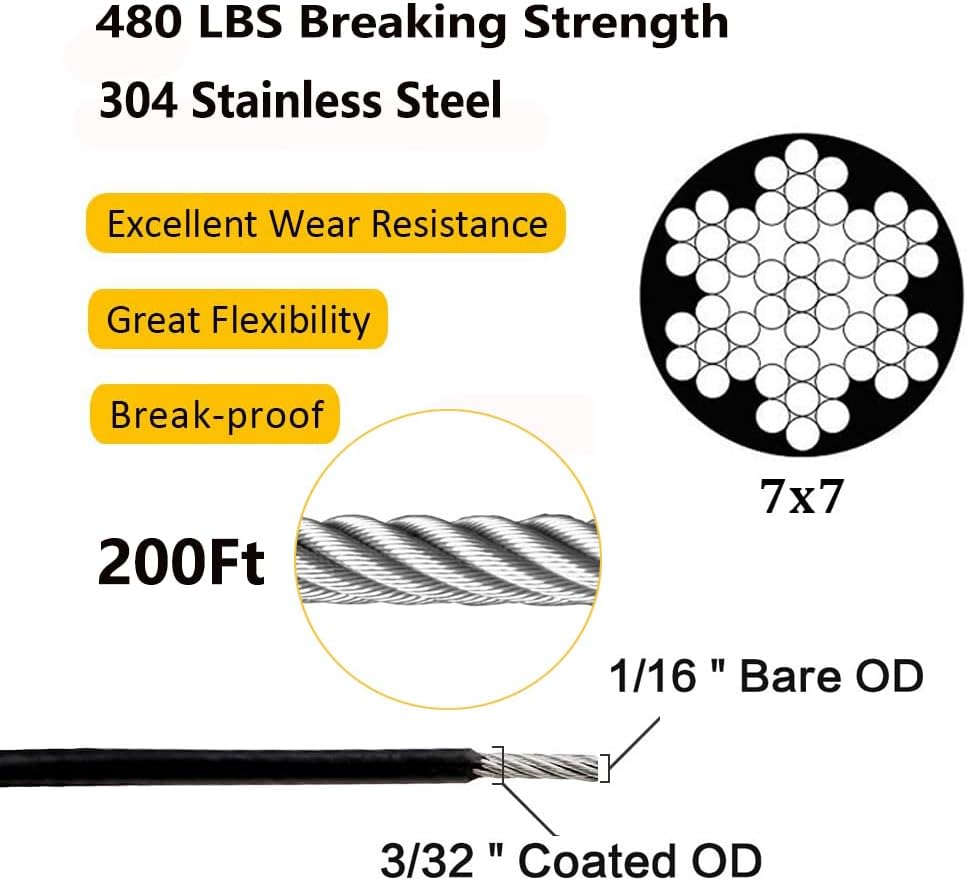 المواد: 304-الفولاذ المقاوم للصدأ. قوة كسر 480 رطل، قوة الشد تصل إلى 1770 مللي باسكال. كابل OD: كابل OD العاري هو 1/16 بوصة، OD مطلي بالفينيل الأسود هو 3/32 بوصة