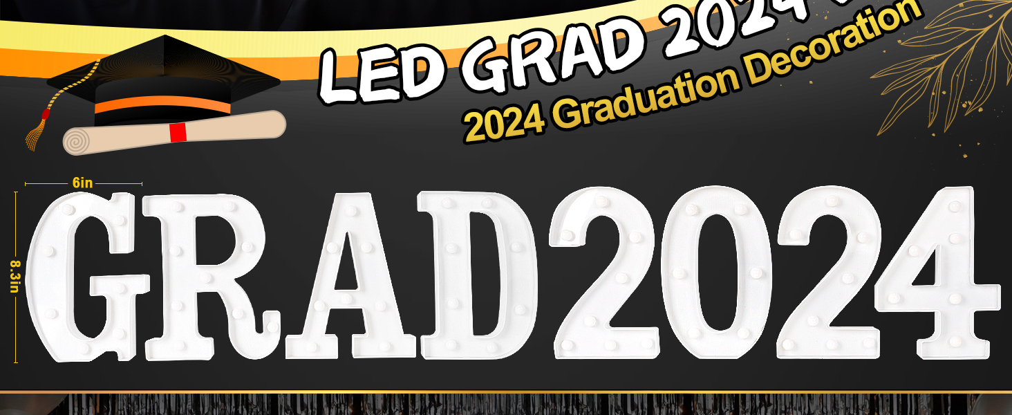 • ديكور التخرج لعام 2024 - تتضمن ديكورات التخرج 8 حروف مضيئة LED "GRAD 2024"، تضيء فصل التخرج لعام 2024 الخاص بالحفلة الخاصة.