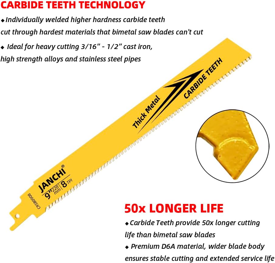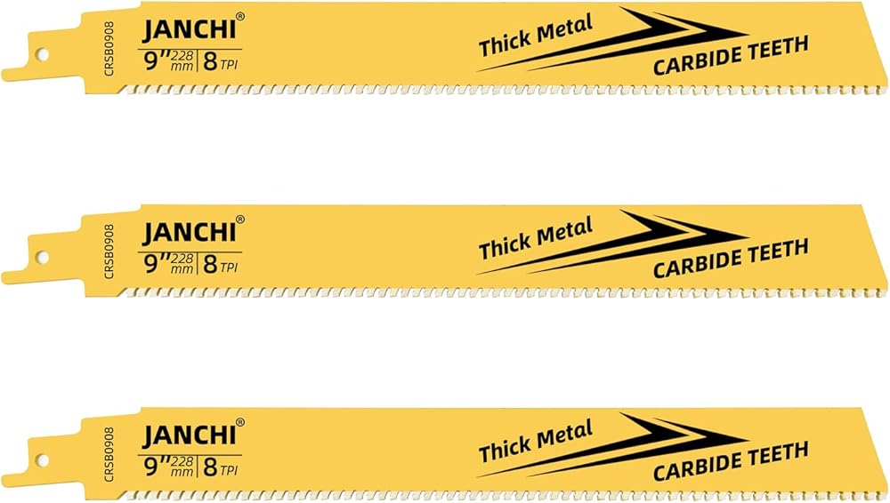 【COMPATIBLE】JANCHI 3pack 9-inch 8 TPI carbide reciprocating saw blade for metal cutting, 1/2 inch universal shank compatible with all major reciprocating saws such as Bosch, Milwaukee, Black&Decker, Hitachi, Makita, Metabo, Dewalt, Porter Cable, Skil, Rockwell etc.