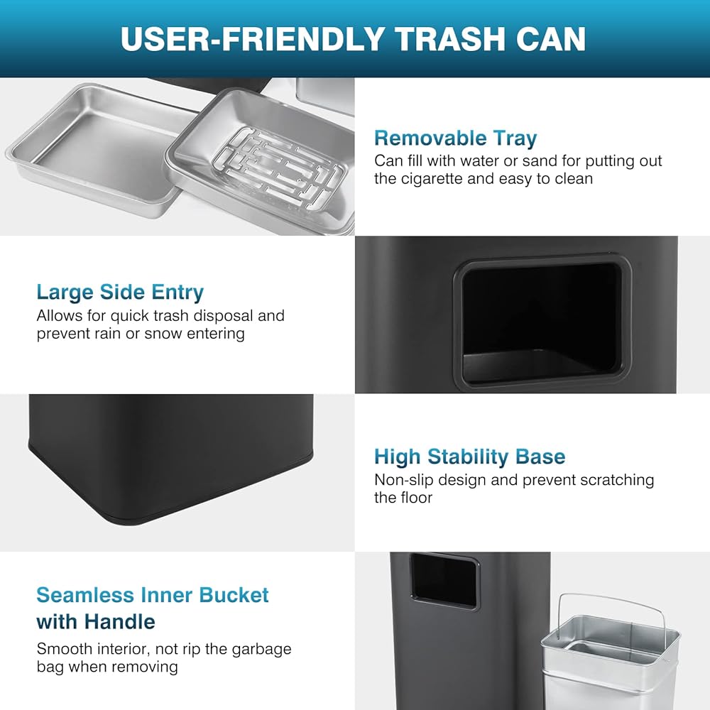 【سلة مهملات سوداء سهلة الاستخدام】تم تصميم سلة المهملات هذه بغطاء قابل للإزالة ودلو داخلي لسهولة تفريغ القمامة وتغيير أكياس القمامة. يمكن لغطاء منفضة السجائر أن يمنع مياه الأمطار والثلج والصقيع من التجمع في حاوية النفايات. مدخل ذو فتحة جانبية واسعة للغاية يجعل من السهل رمي سلة المهملات أثناء التنقل دون لمس الغطاء.