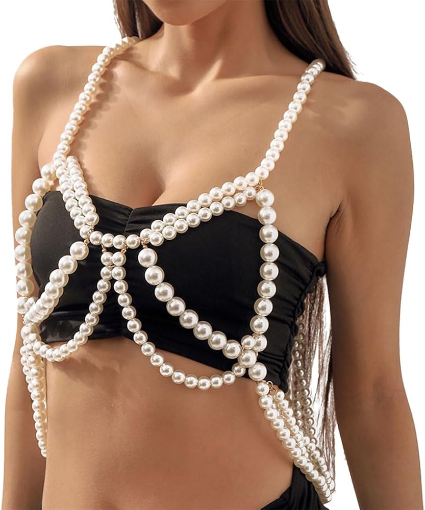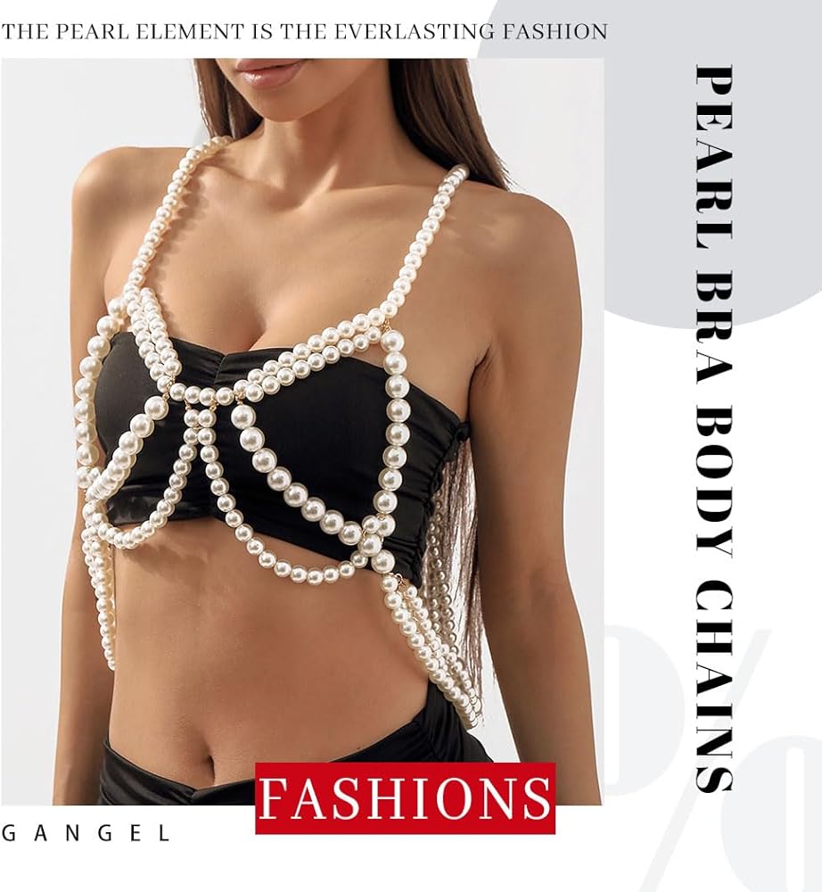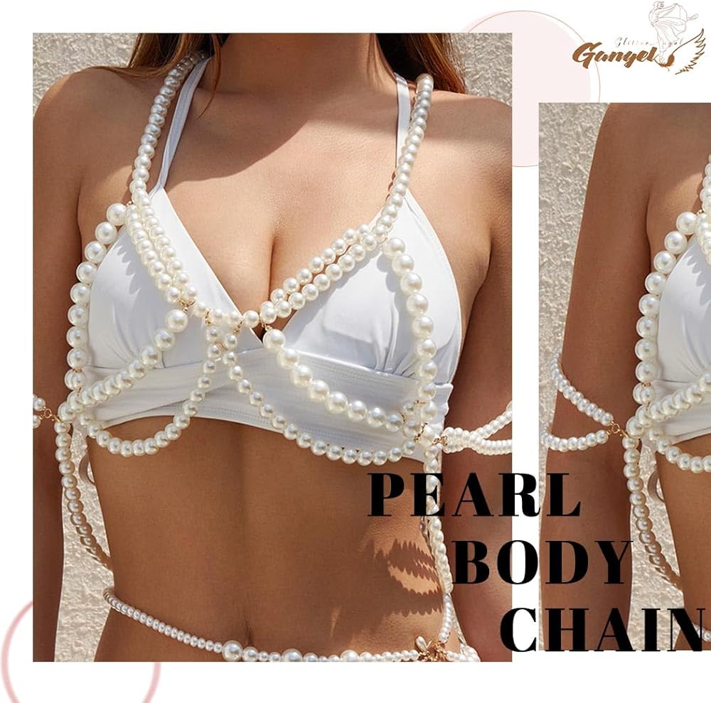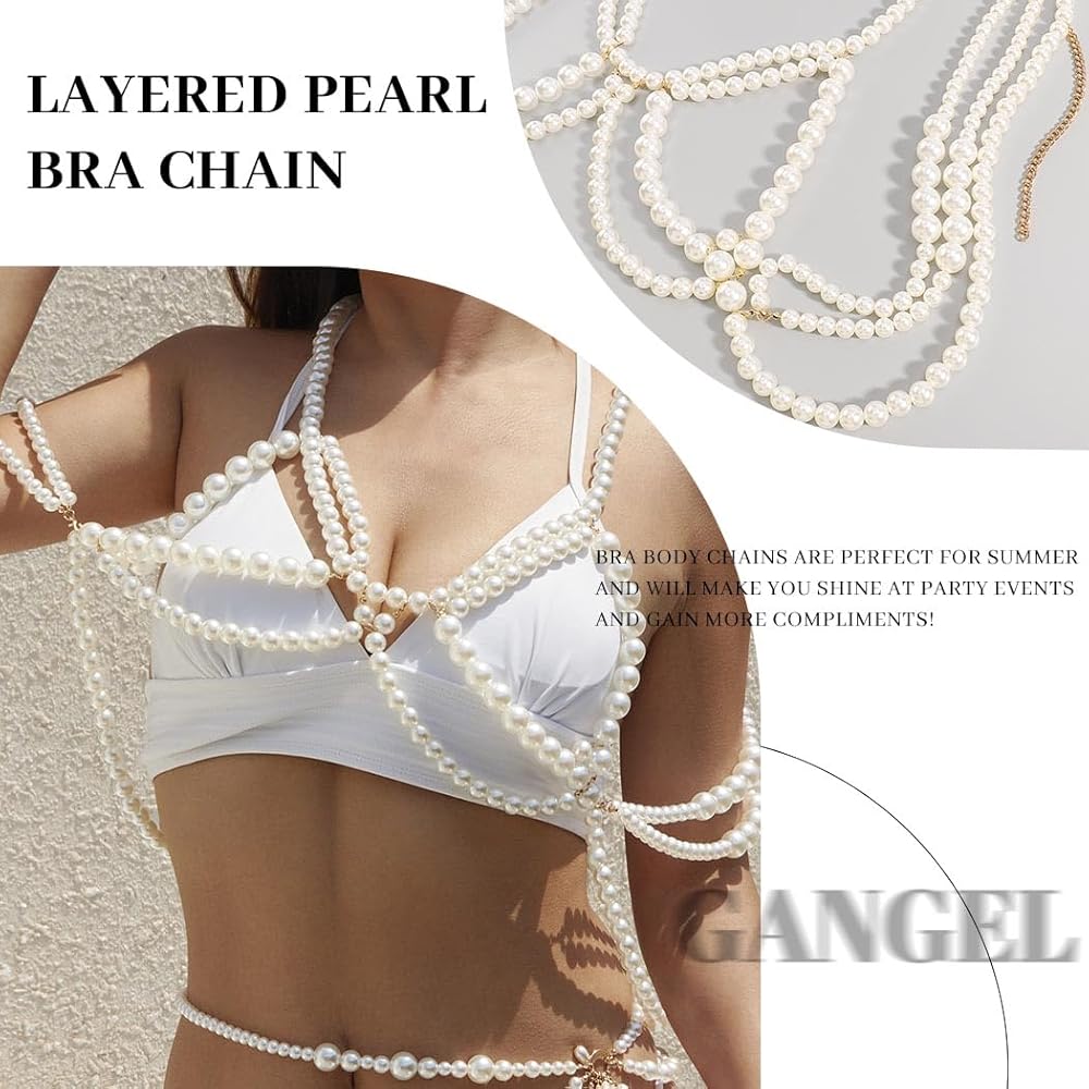 Gangel لؤلؤة الجسم سلسلة اللؤلؤ الأبيض سلاسل الجسم مثير الصدرية الأعلى سلسلة الرسن الكتف سلسلة الطبقات الجسم سلسلة بيكيني الهذيان مجوهرات الجسم للنساء والفتيات