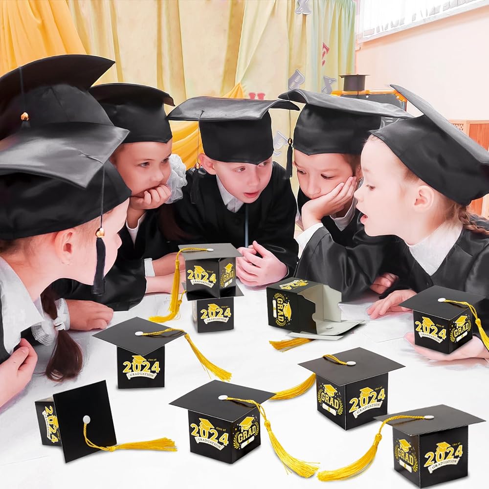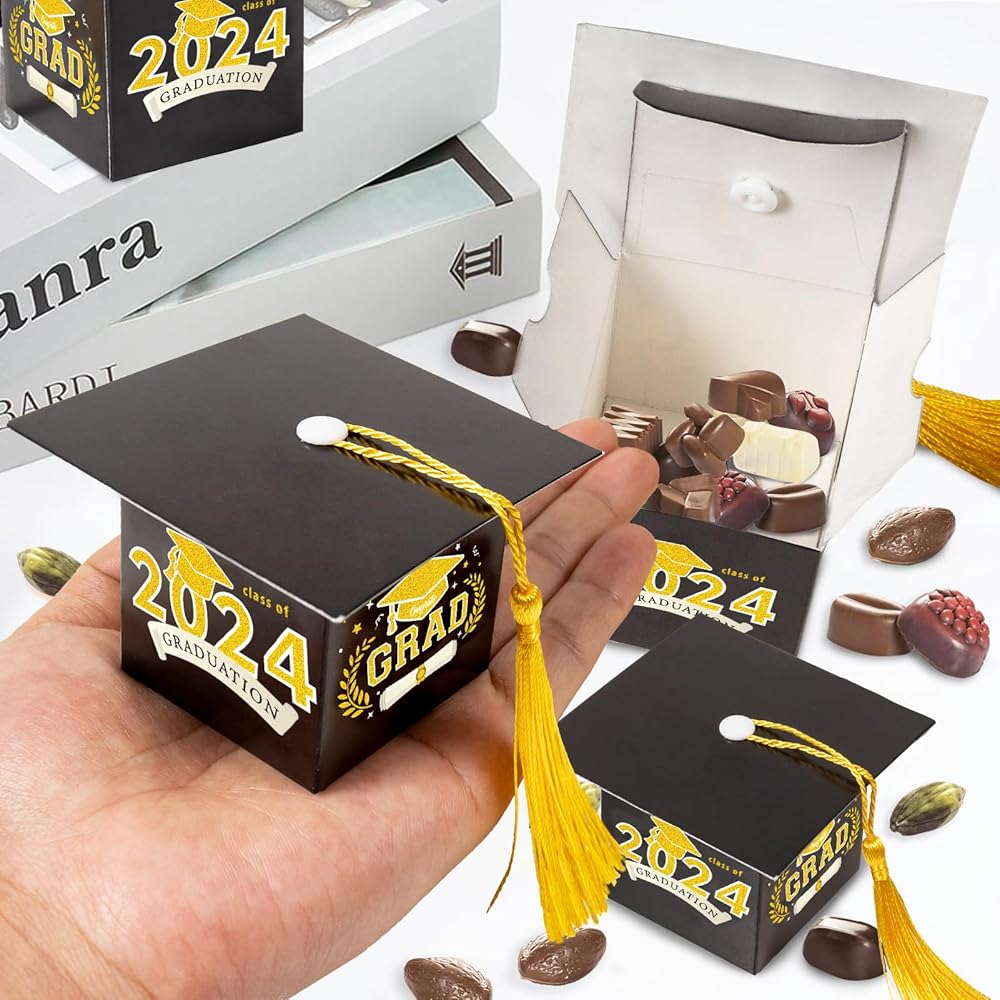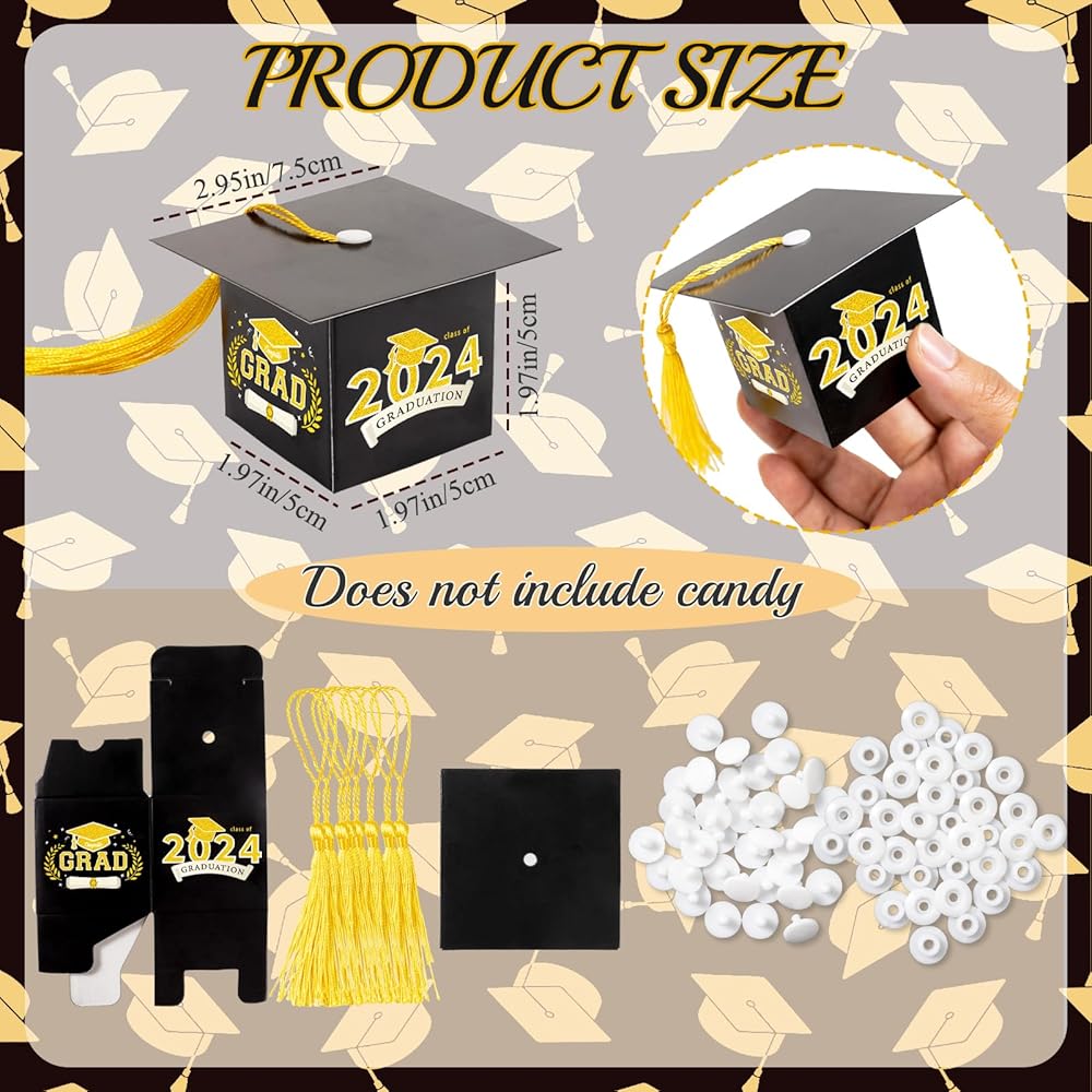 ✔️【صندوق حلوى عالي الجودة】صناديق هدايا التخرج باللون الذهبي الأسود مصنوعة من ورق عالي الجودة، وغير منحني، ومتين، وخفيف الوزن؛ يبلغ المقاس 1.9 سم × 1.9 سم × 1.9 سم، صغير ولطيف، الحجم المناسب تمامًا لحمل الشوكولاتة الصغيرة والشارات والحلوى وما إلى ذلك، مما يجعلها مثالية كهدايا لحفلات التخرج.
