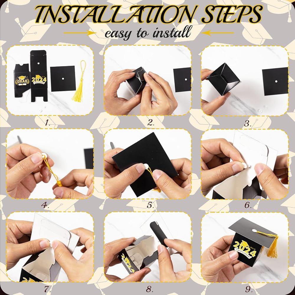 ✔️【سهلة التجميع】من السهل والسريع تجميع صناديق هدايا قبعة التخرج الصغيرة والرائعة، دون الحاجة إلى الغراء؛ ما عليك سوى طي الأزرار واستخدامها لتثبيت الشرابة والبطاقة كجزء من غطاء التخرج العلوي؛ كانت علب الحلوى الصغيرة النهائية لطيفة للغاية، وتتناسب تمامًا مع ديكور التخرج الخاص بك.