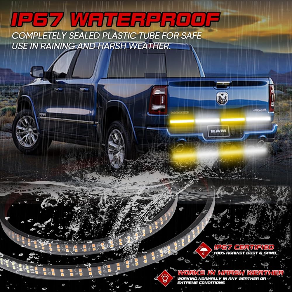 【IP67 مقاوم للماء】 شريط الإضاءة الخلفي هذا مغلف بأنابيب بولي كلوريد الفينيل المرنة، مما يوفر خصائص مقاومة للماء والغبار والسحق مناسبة لمختلف البيئات القاسية. يتصل الكابل السميك بشريط الأضواء القوية عبر موصلات مقاومة للماء، ويوجد مصهر داخل مفتاح ولاعة السجائر لحماية الدائرة.