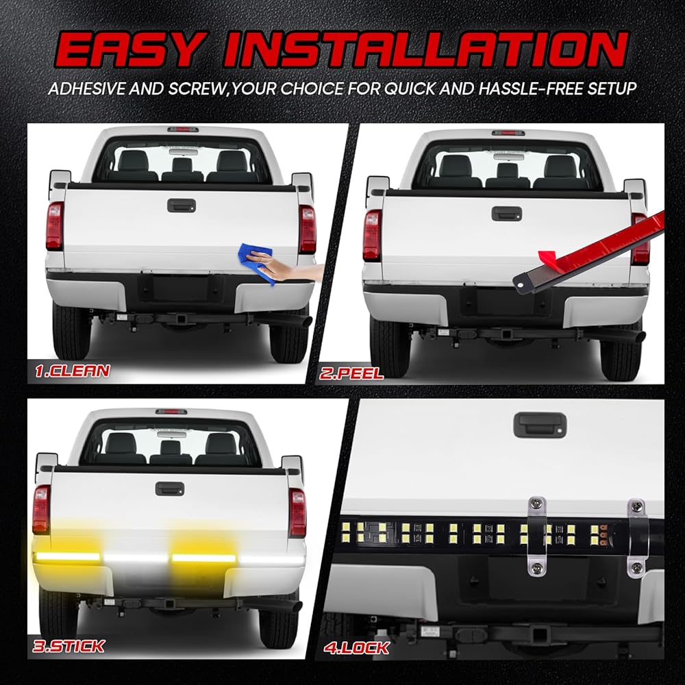 【تركيب سهل】يستغرق التثبيت حوالي 5 دقائق. لا حاجة للحفر، فقط قم بتنظيف سطح التثبيت ومسحه، ثم قم بتقشير ولصق شريط ضوء الباب الخلفي باستخدام شريط ذاتي اللصق عالي اللزوجة للتركيب الآمن. حامل شريط الضوء يضمن التثبيت المستقر.