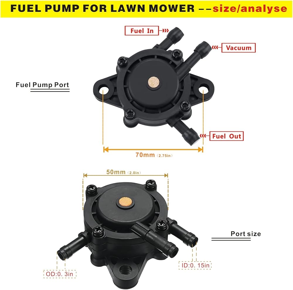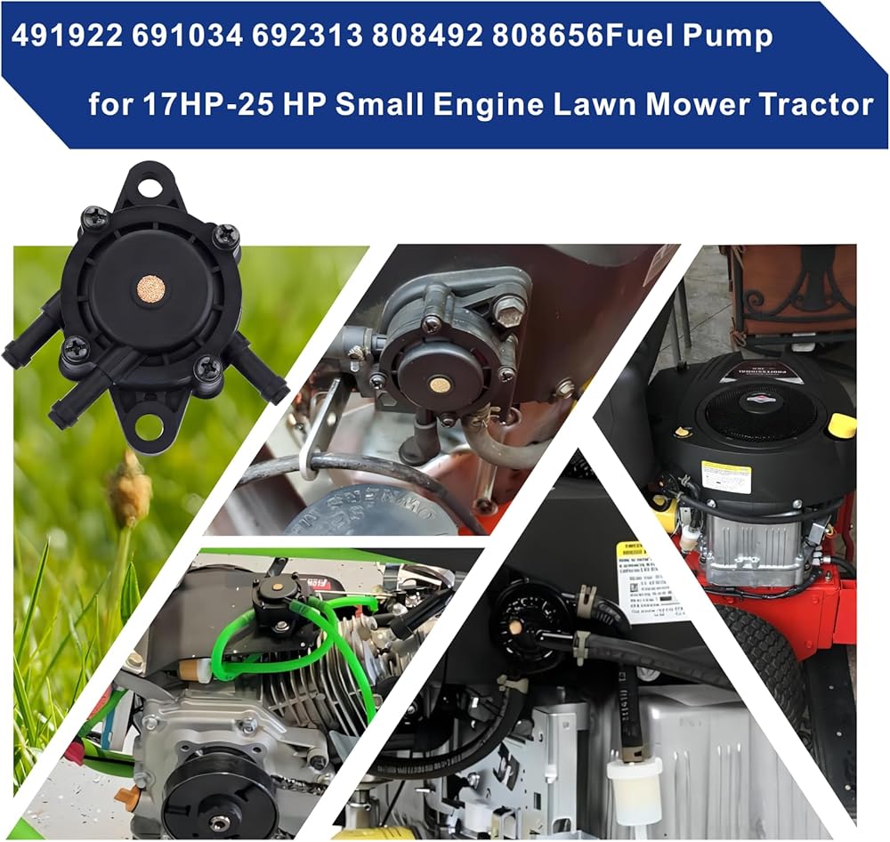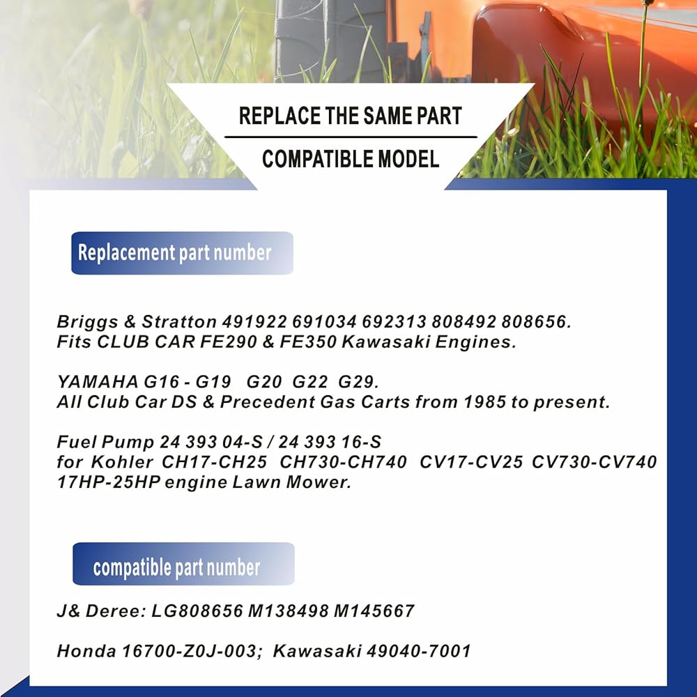 【Briggs fuel pump 799056 Kit】 This Fuel Pump allows you to have 1 oil pump, 1 filter, 1 NBR Fuel Line Hose, 2 Secure the fuel line clamp 2 Elastic Hose Clamps;Vacuum Fuel Pump with Fuel Filter for Kohler 17HP-25 HP Briggs and Stratton J&Deere Honda Yamaha Small Engine Lawn Mower Tractor,and All Club Car DS & Precedent Gas Carts from 1985 to present, CLUB CAR FE290 & FE350 Kawasaki Engines. 【597338 Briggs Fuel Pump Compatible Model】kohler 26hp 747cc 7000 series fuel pump Replace for 491922 691034 692313 808492 808656, J& Deere LG808656, M138498, M145667, Kawasaki 49040-7001, Yamaha G16 - G19 & G20 & G22 & G29、john deere lt166 fuel pump. 【Cub cadet xt1 fuel pump Replacement Model】kohler command 20hp fuel pump kohler ch23 Fuel pump replaces for 295cc & 350cc FUJI-ROBIN MCI, KAWASAKI FE290 & FE350 All Mower Exmark John Deere Cub Cadet Toro for Briggs & Stratton 597338 and Kawasaki 15 thru 25 HP engines;fit 407777 28B702 28B707 28M707 28N70 28P777, 28Q777 351442 and 35144 【14 hp vanguard fuel pump Compatible Model】briggs 491922 Compatible kohler sv725 fuel pump and J&Deere L120 L118 LA120 LA130 LA140 LA150 Z425 EXTRAK, john deere d140 fuel pump、john deere e170 fuel pump. LA105 LA115 D100 D110 X125 X145 L105 X140 LA135 LA145 X130R D130 & Z225 L107 L108 L115 X110 X120 uc18349. D140 X165 X155R 30139 TXT / RXV / ST MEDALIST CLAY CAR 4 CYCLE MODELS 1994-UP. 【Kohler cv20s fuel pump Compatibility】19 hp briggs and stratton fuel pump Compatible with Honda 16700-Z0J-003, Honda EB11000 EN2000 EN2500 generator, Honda GC135 GC160 GC190 GX610 GX620 GX670 And GXV530 GXV610 GXV620 GXV670 engine、Kohler CH17-CH25 CV17-CV25 CH730-CH740 CV730-CV740/ 24 393 04-S/24 393 16-S,for 17 HP thru 25 HP engines.