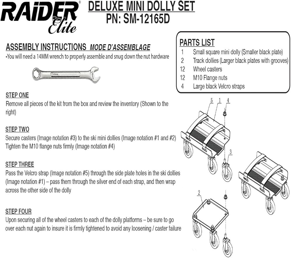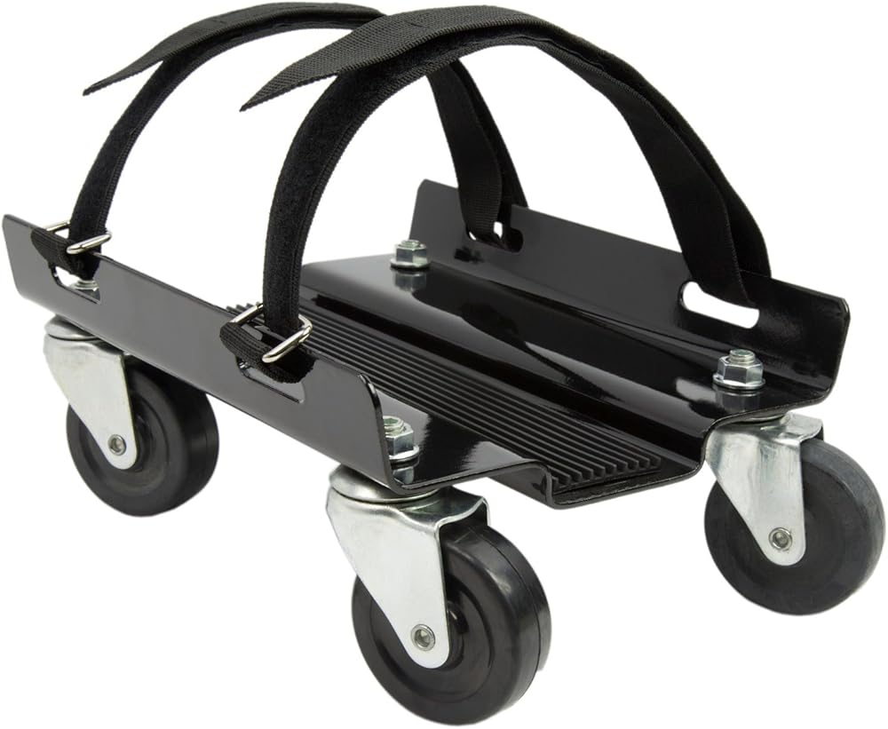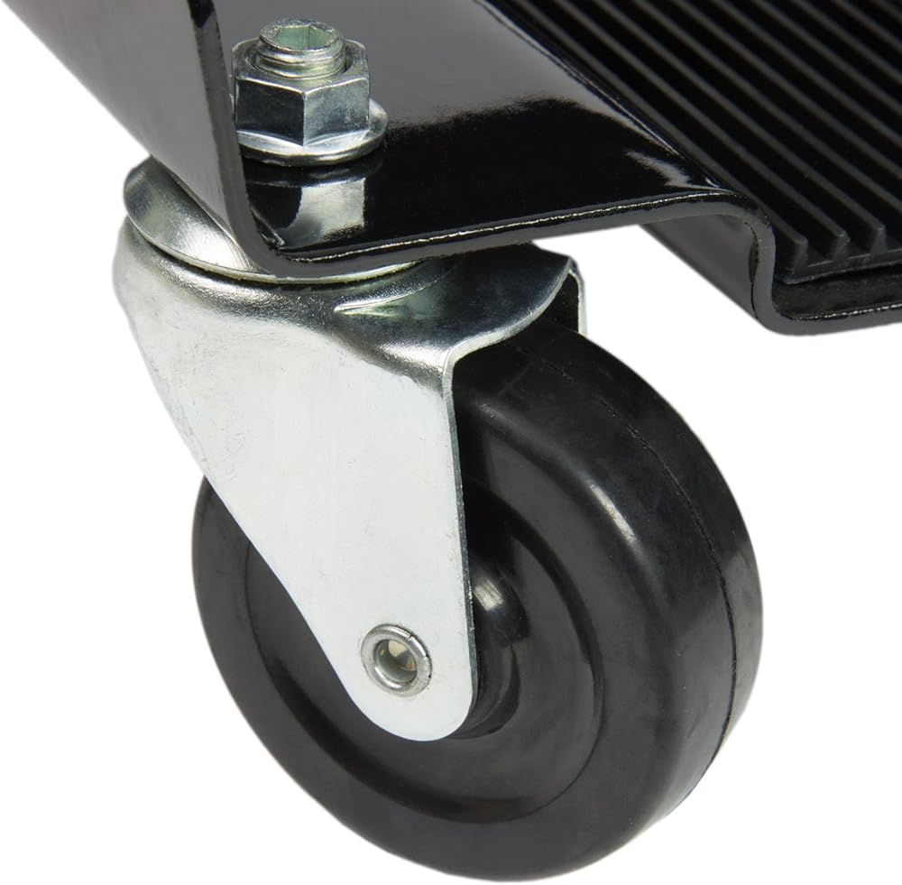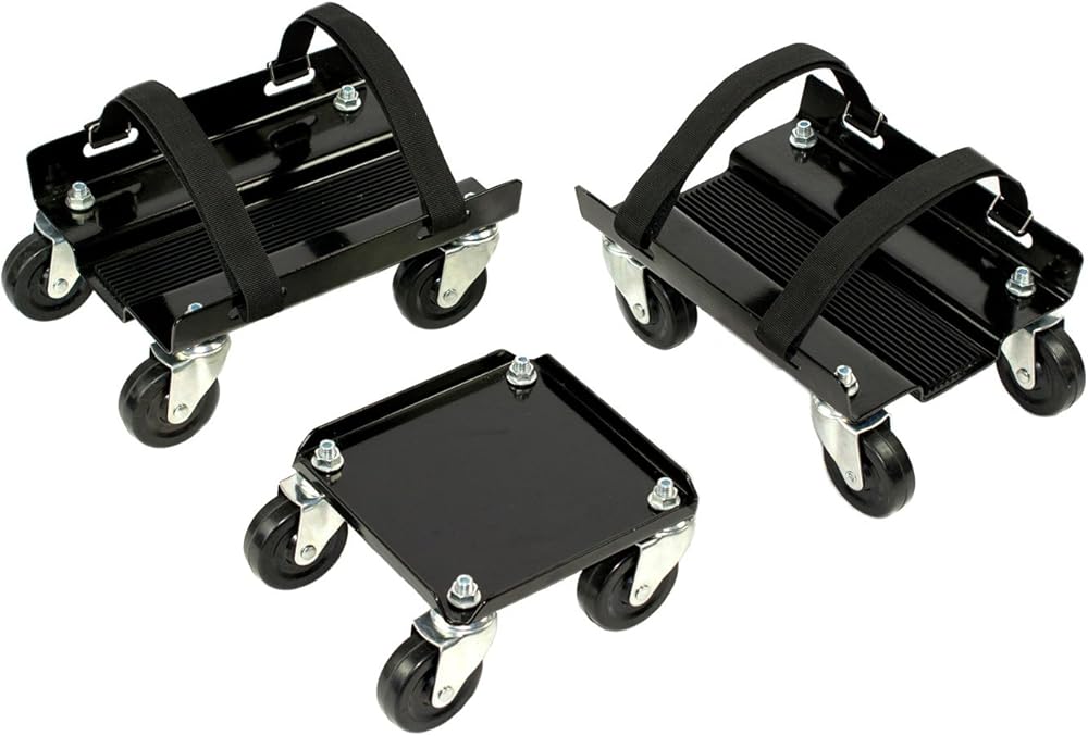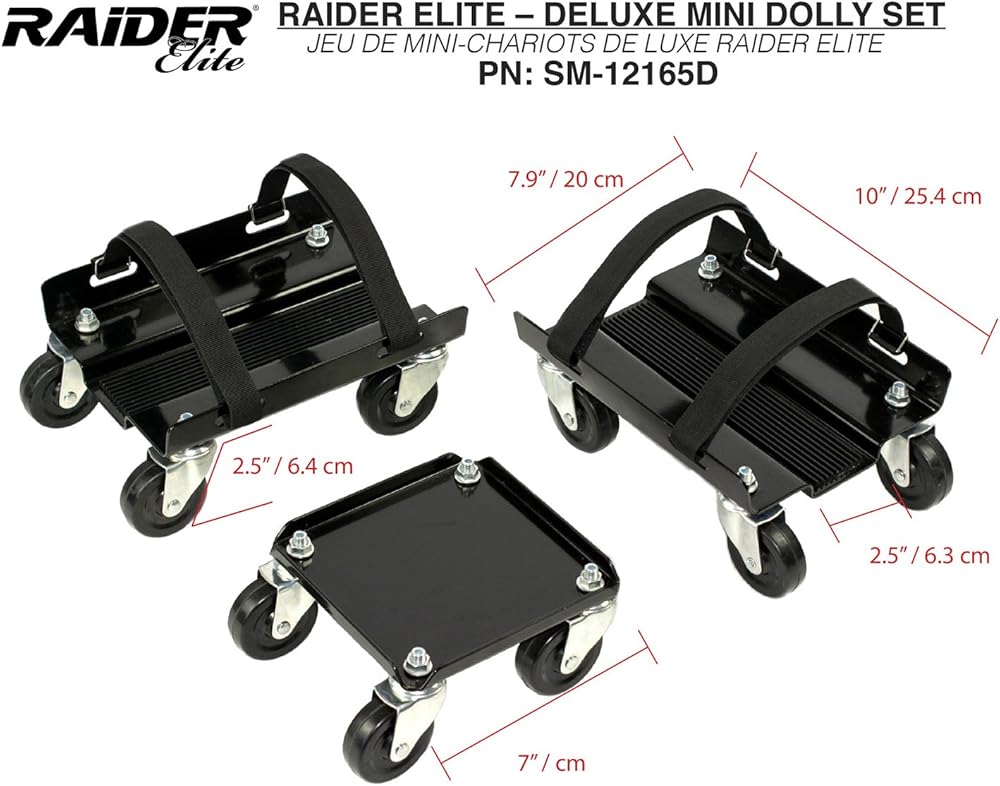 The Raider Mini Dolly kit makes it easy to move your snowmobile around paved surfaces or inside the garage. This kit comes with 3 four-wheeled dollies that go under the skis and under the track. These dollies are constructed of heavy-duty steel to prevent sagging or bending under the snowmobile's weight, and the black powder coating prevents corrosion. When you need to move the snowmobile around the garage, these Raider Mini Dollies get the job done right.