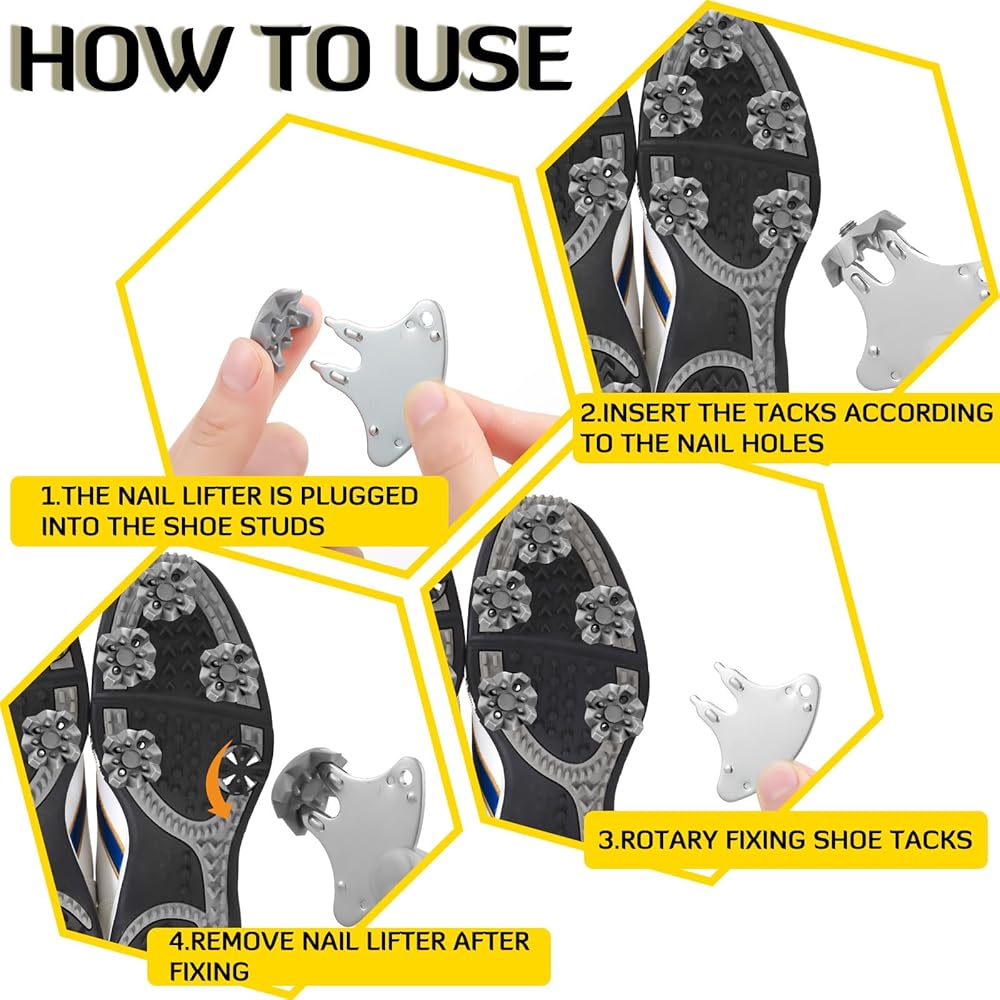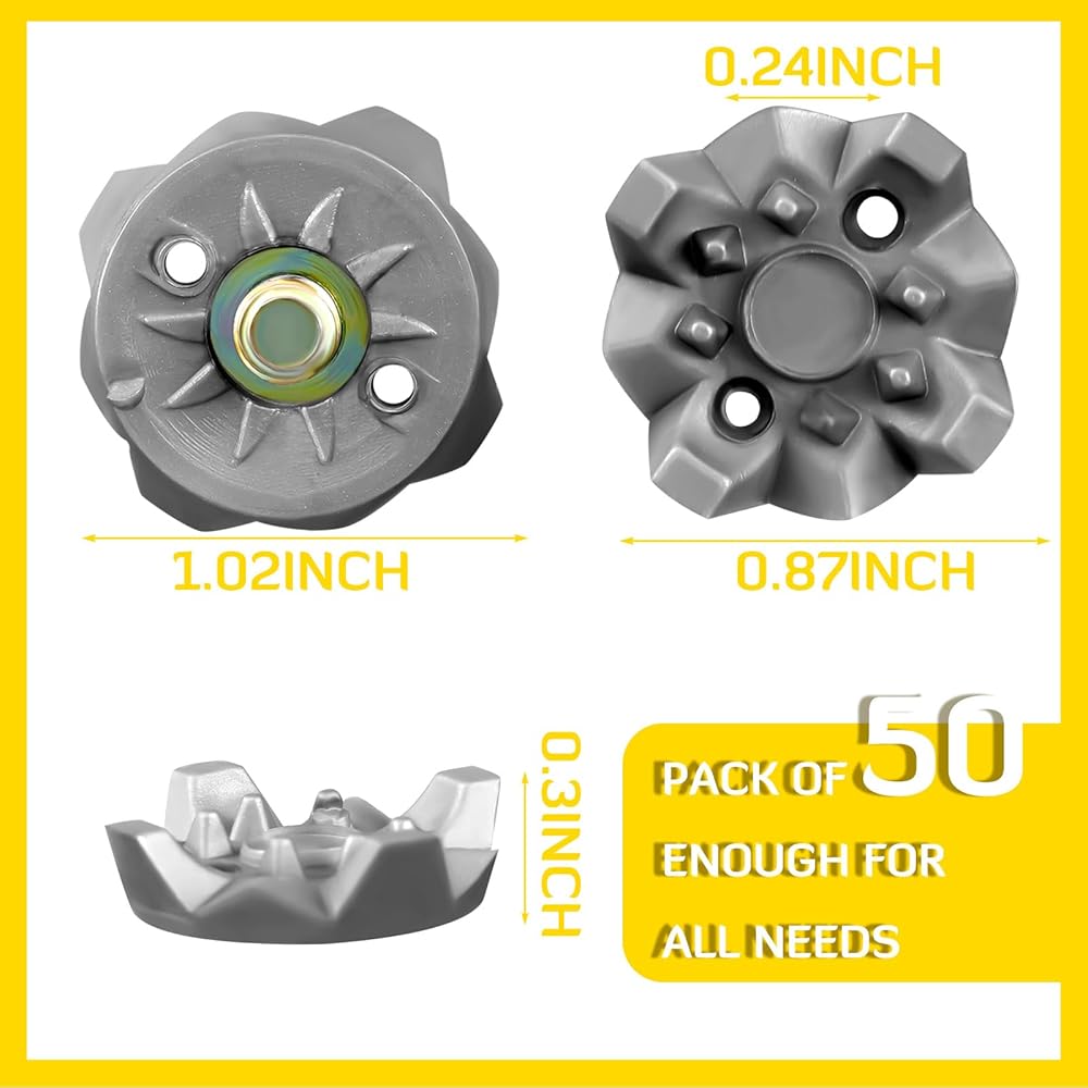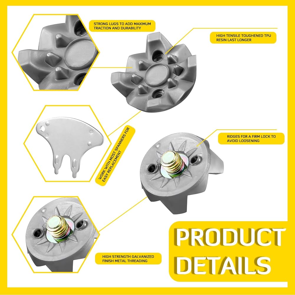 Our kit designed with 50 golf shoe cleats and a golf spanner, crafted from durable TPU and metal, offers pronounced stability and enhanced traction to transform your golfing experience. Our tacks feature an intelligent 6 way stability design and use 1/4 inch metal threaded screws and 1 inch /24 mm diameter tacks, reducing slippage and making continuous play.