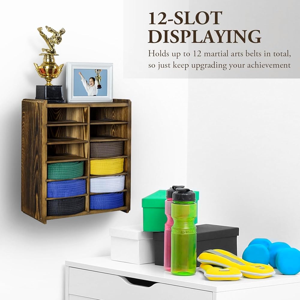 حامل حزام خشبي للفنون القتالية معلق على الحائط ورف تذكاري لتخزين وتنظيم الرتب والجوائز مع خيار التركيب المزدوج