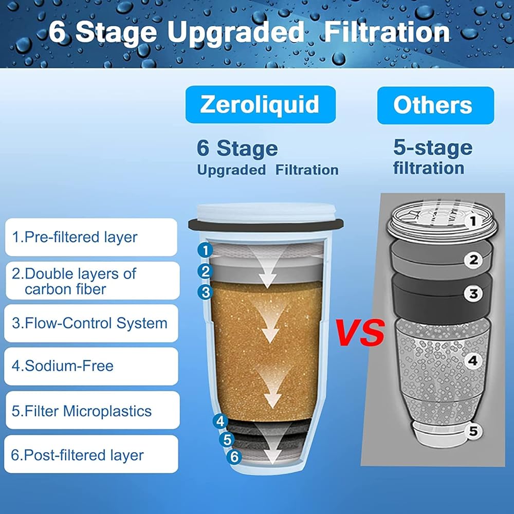 Zeroliquid ZR-001، ZR-017، ZR-004 فلاتر مياه بديلة للأباريق والموزعات، نظام ترشيح متطور من 6 مراحل لـ 0 TDS، إزالة الرصاص، الكلور، الفلورايد، PFOA/PFOS (عبوتان)