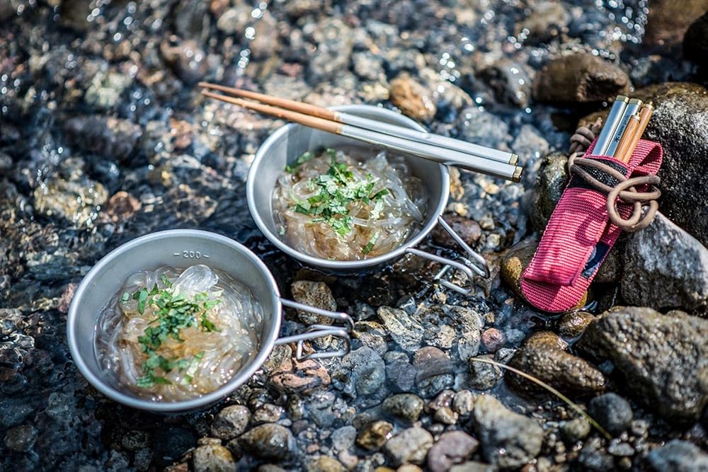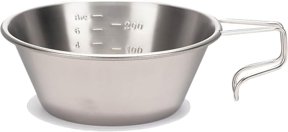 Designed and manufactured in Japan, the Titanium Backpackers Cup is made of sturdy Japanese Titanium. Intended to be used for cooking and measuring, the Backpackers Cup features graduated measurement lines and a sturdy handle. It is lightweight and the handle serves as a hook for easy carrying and storage.